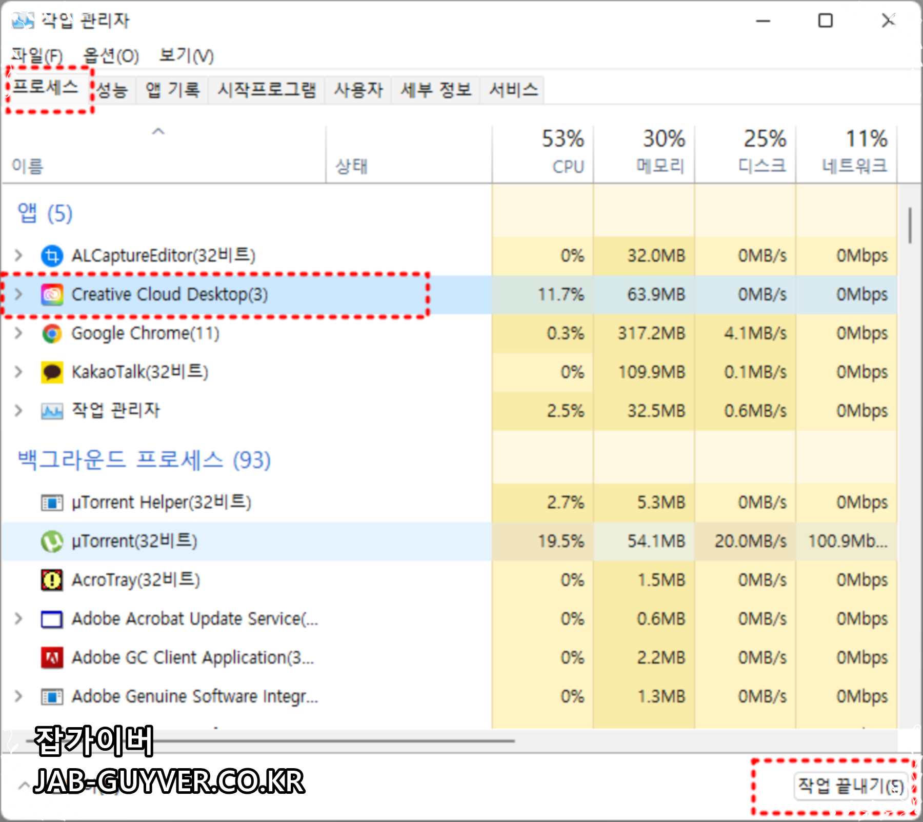 Adobe Creative Cloud 자동 업데이트가 실행중이기 때문에 작업관리자를 통해 프로그램을 강제로 종료합니다.