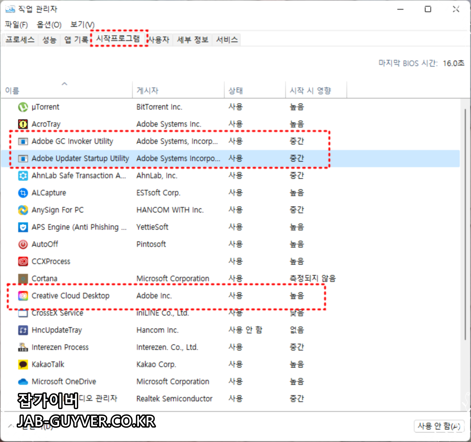 윈도우 부팅 시 Creative Cloud 업데이트 프로그램이 실행되지 않도록 사용안함으로 변경합니다.