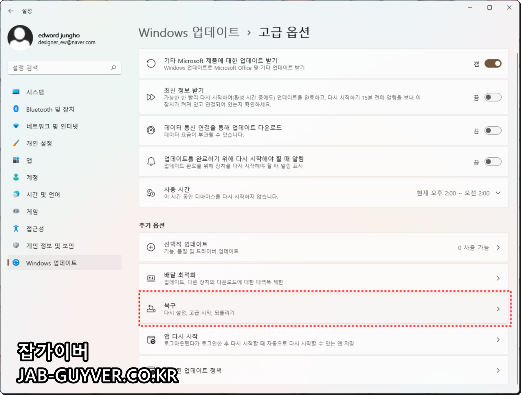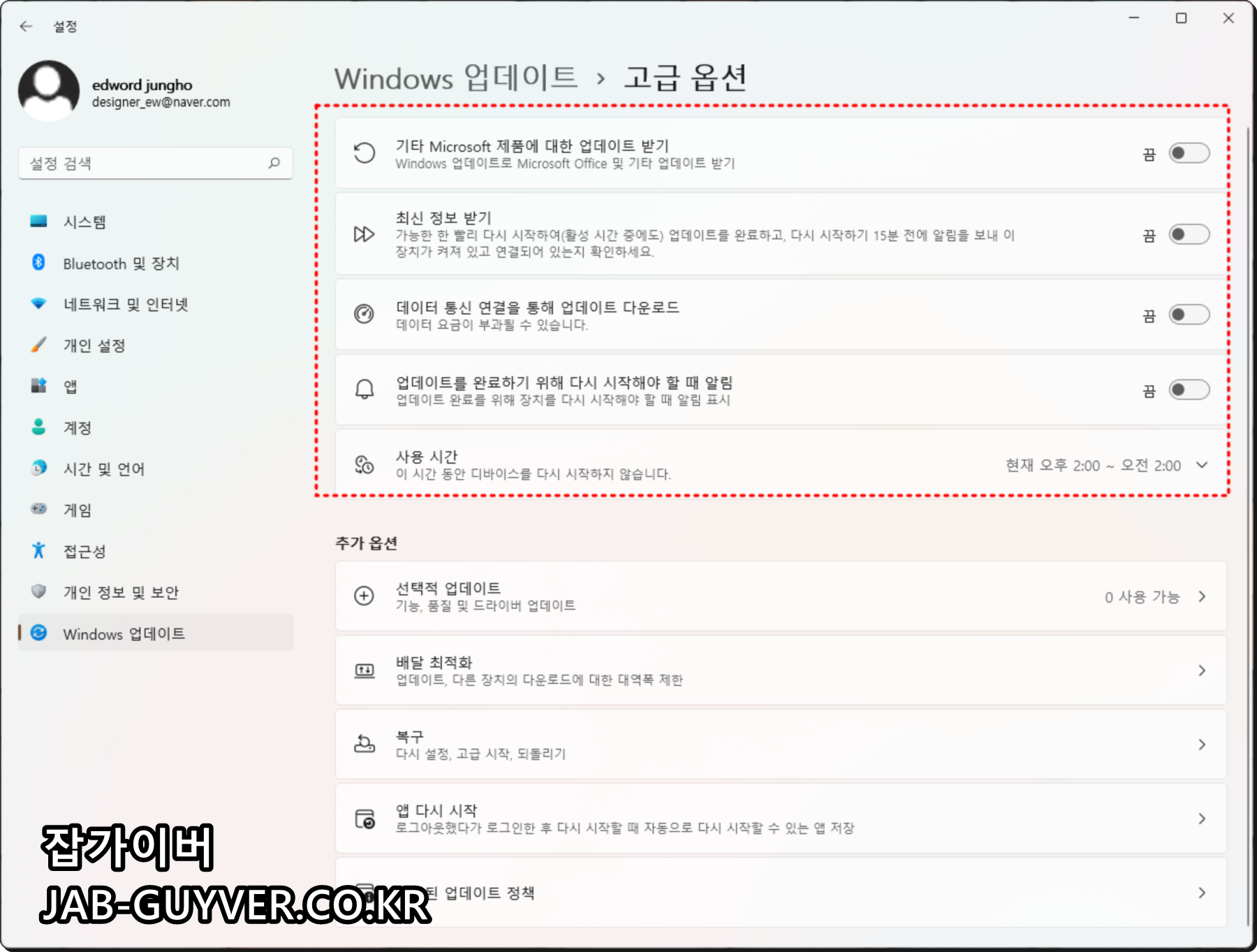 윈도우11 업데이트 옵션 시간설정