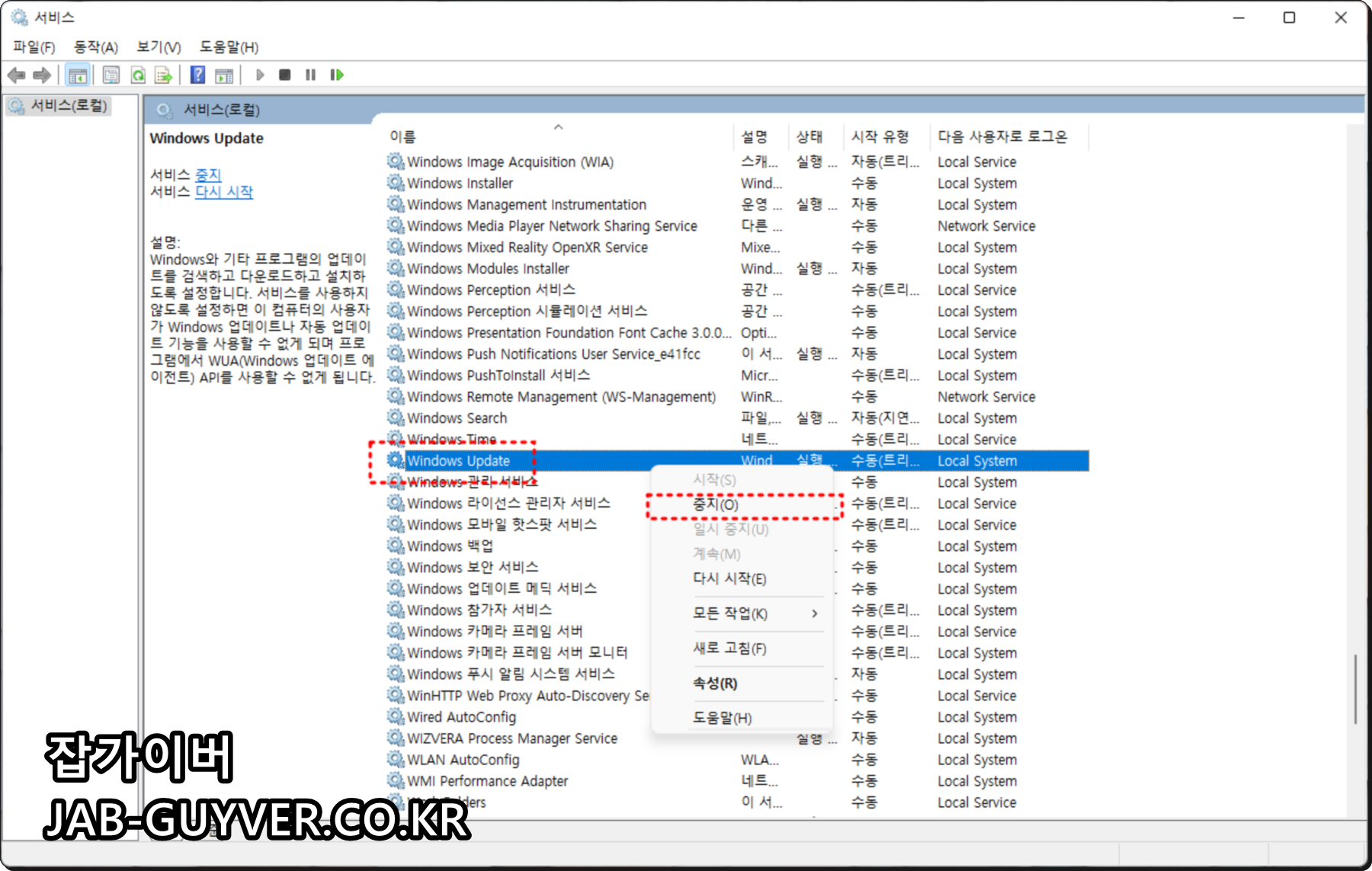 서비스 로컬탭에서 Winodws Update 기능을 사용하지 않도록 중지로 변경합니다.