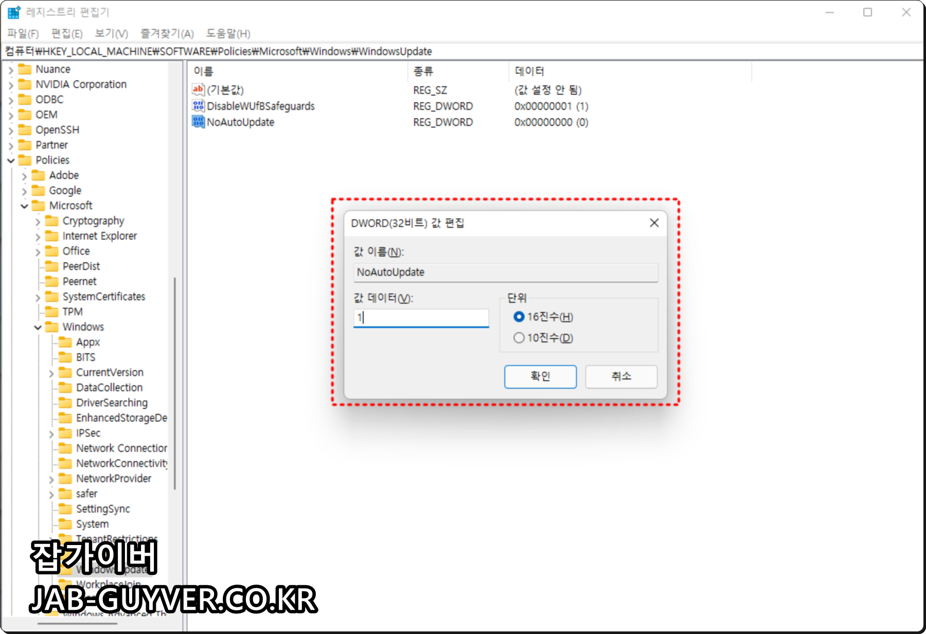 NoAutoUpdate 환경변수 수정을 통해 값 데이터를 1 단위 16진수로 변경 후 컴퓨터를 재부팅합니다.