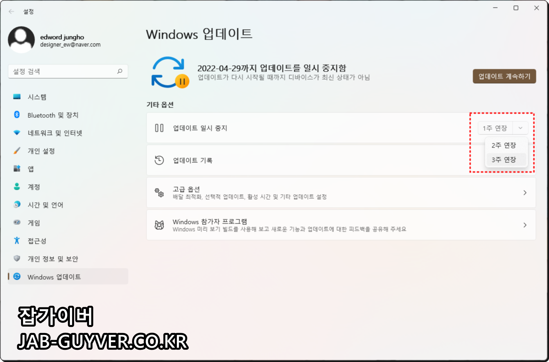 업데이트 연기는 최대 3주가지 연장이 가능하며 필요에 따라서 계속 업데이트 차단을 설정하면 됩니다.