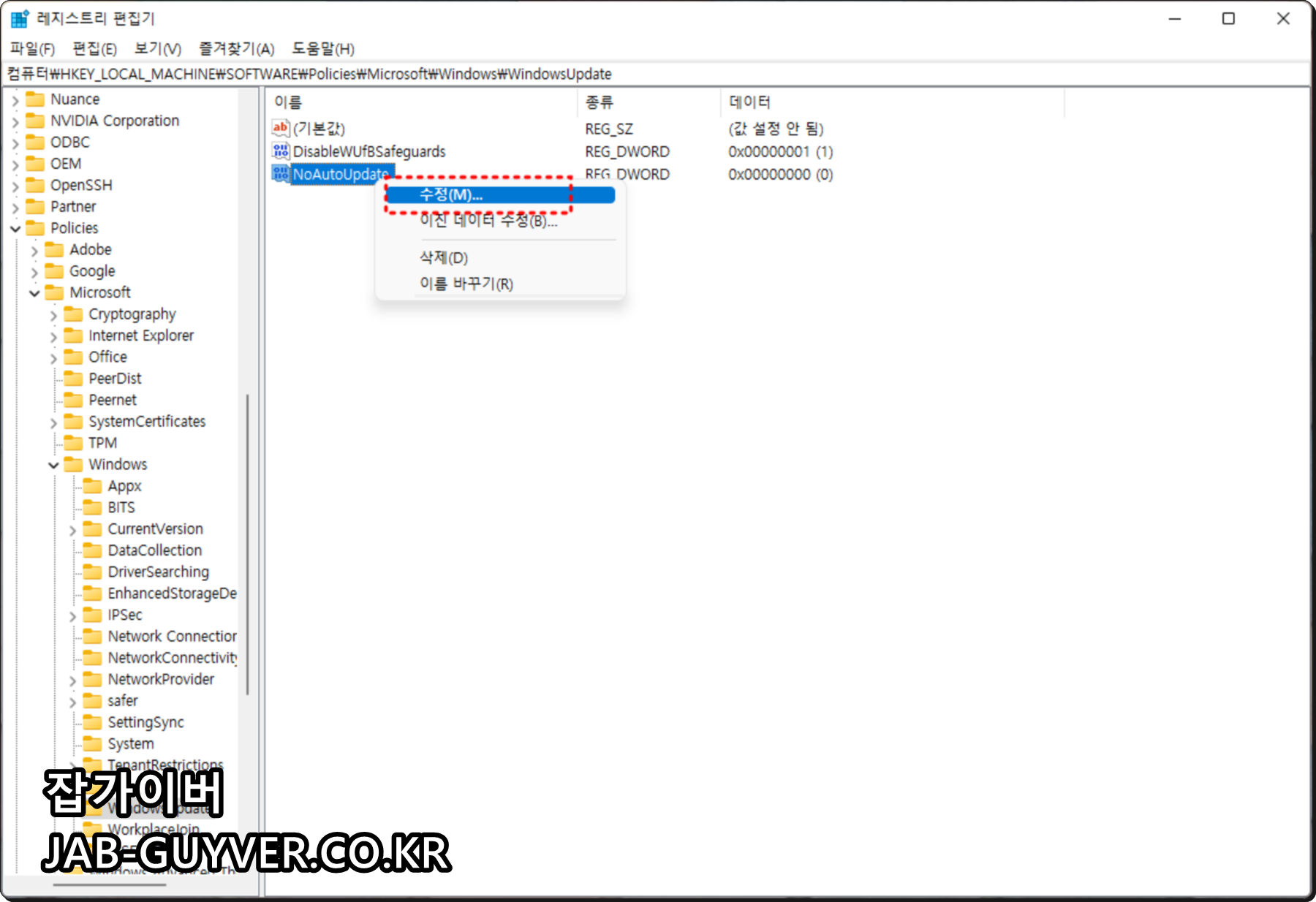 컴퓨터\HKEY_LOCAL_MACHINE\SOFTWARE\Policies\Microsoft\Windows\Windows Update