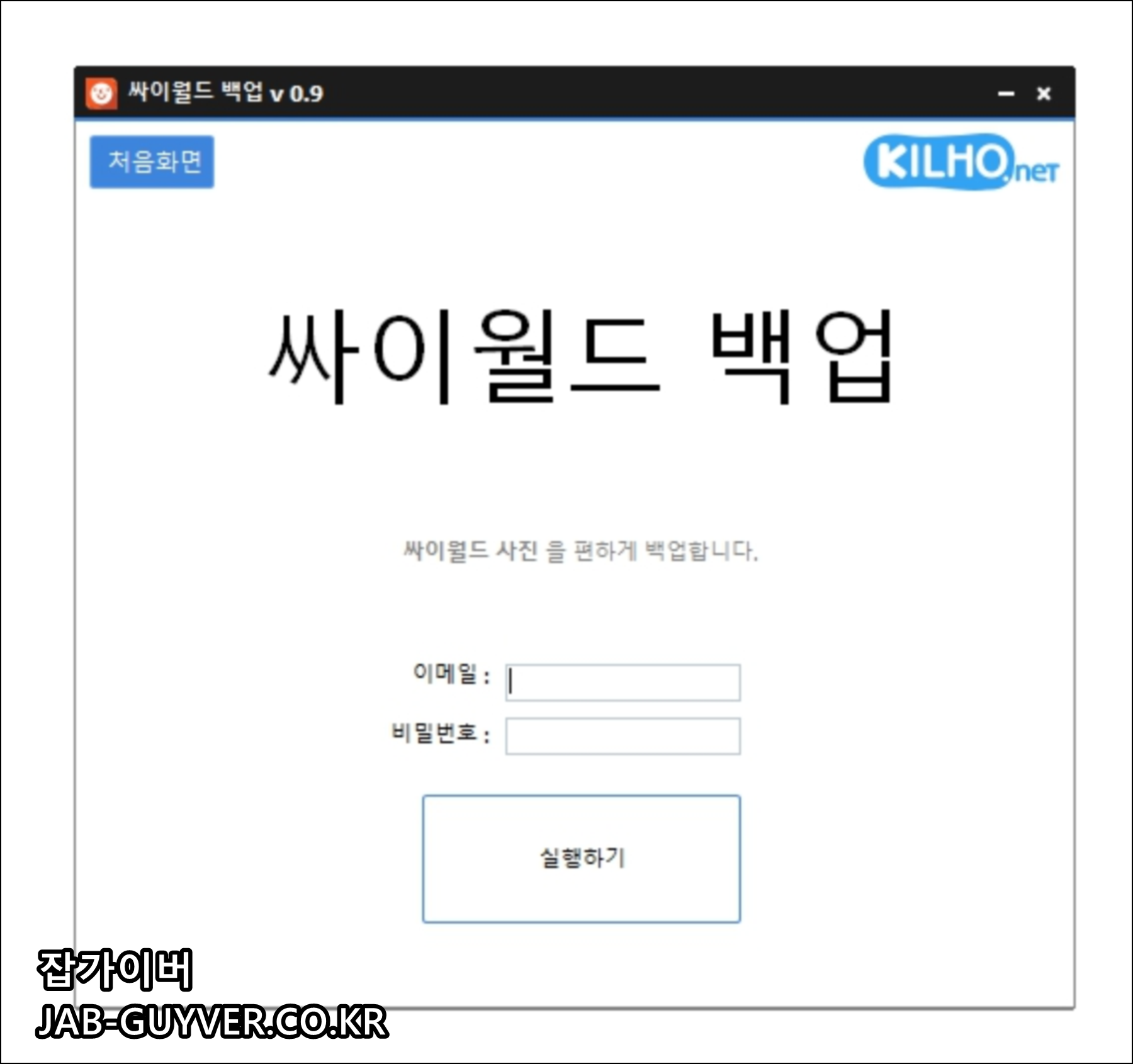 이후 본인의 싸이월드 사진을 편하게 백업이 가능한 프로그램이 실행되며 기존 본인계정의 싸이월드 계정의 이메일 및 비밀번호로 로그인 후 실행하기를 선택하면 자신이 업로드 한 싸이월드 사진을 저장할 수 있습니다.