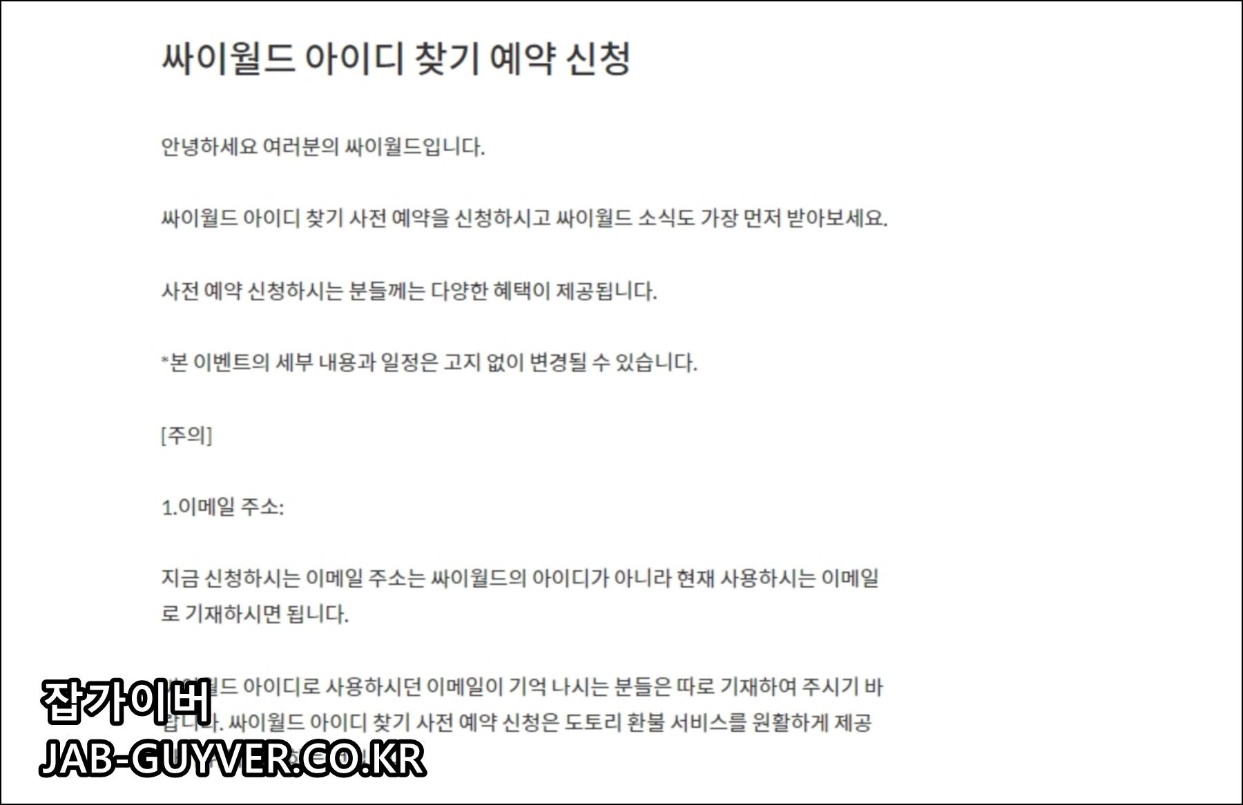 그럼 싸이월드 아이디 찾기 사전예약이 신청되며 계정정보가 확인되면 메일로 전달됩니다.