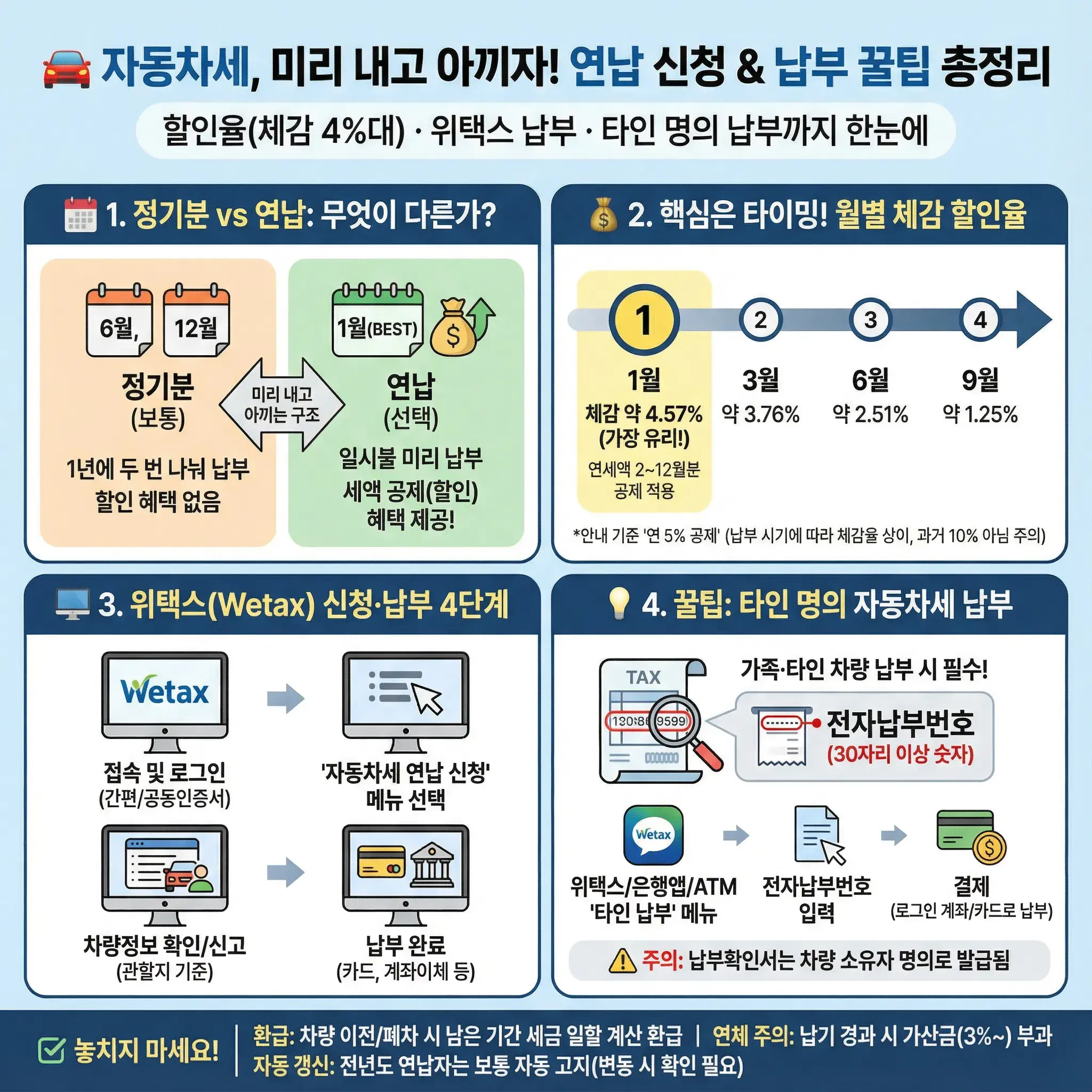 자동차세 연납 신청으로 아끼는 법: 할인율(체감 4%대) · 위택스 납부 · 타인 명의 납부까지