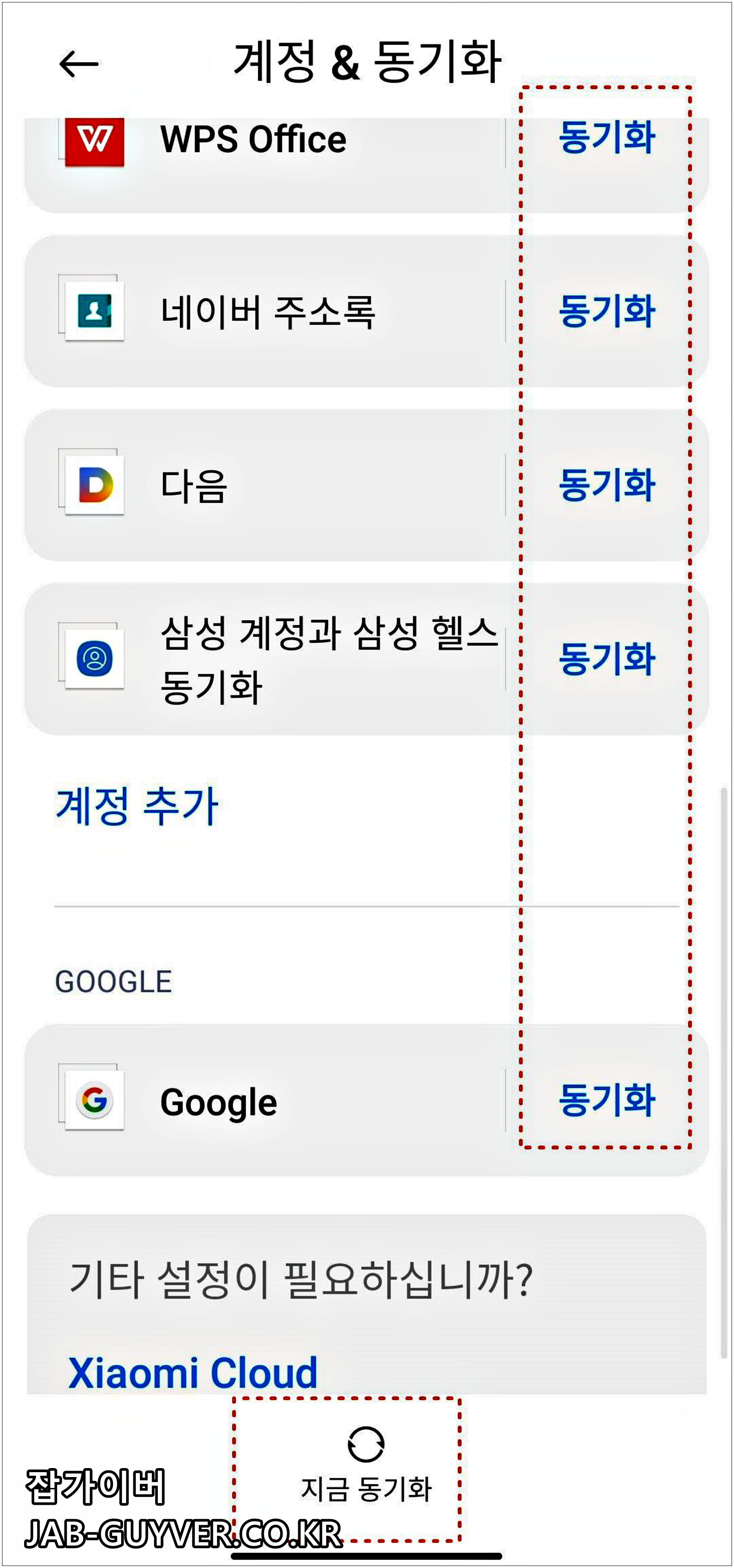 안드로이드 기반인 핸드폰이라면 설정에서 계정 & 동기화에서 데이터 자동 동기화 및 와이파이 상태에서 자동동기화를 설정할 수 있으며 지금동기화를 통해 수동으로 동기화가 가능하며 안드로이드 기반인 샤오미, 갤럭시, 구글 픽셀등 설정방법은 모두 동일합니다.