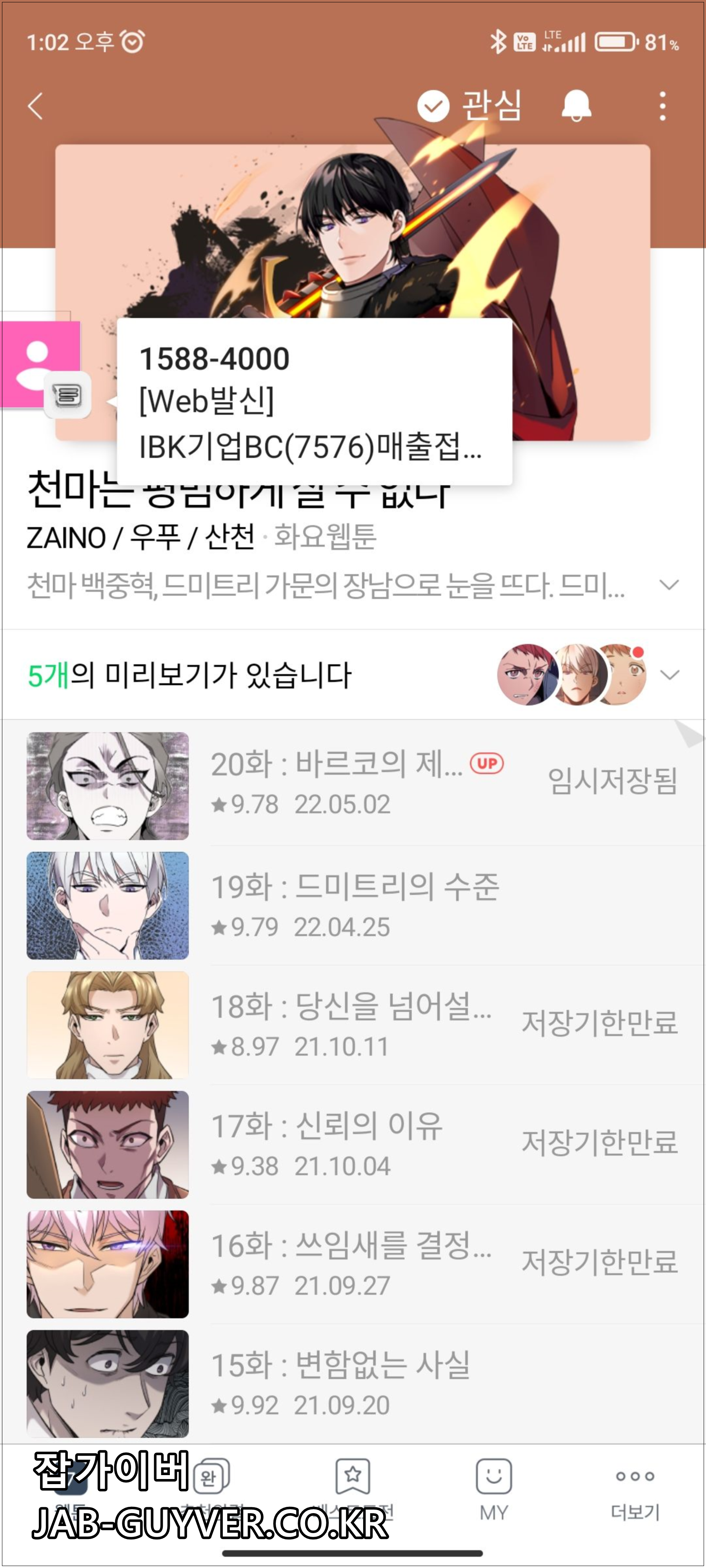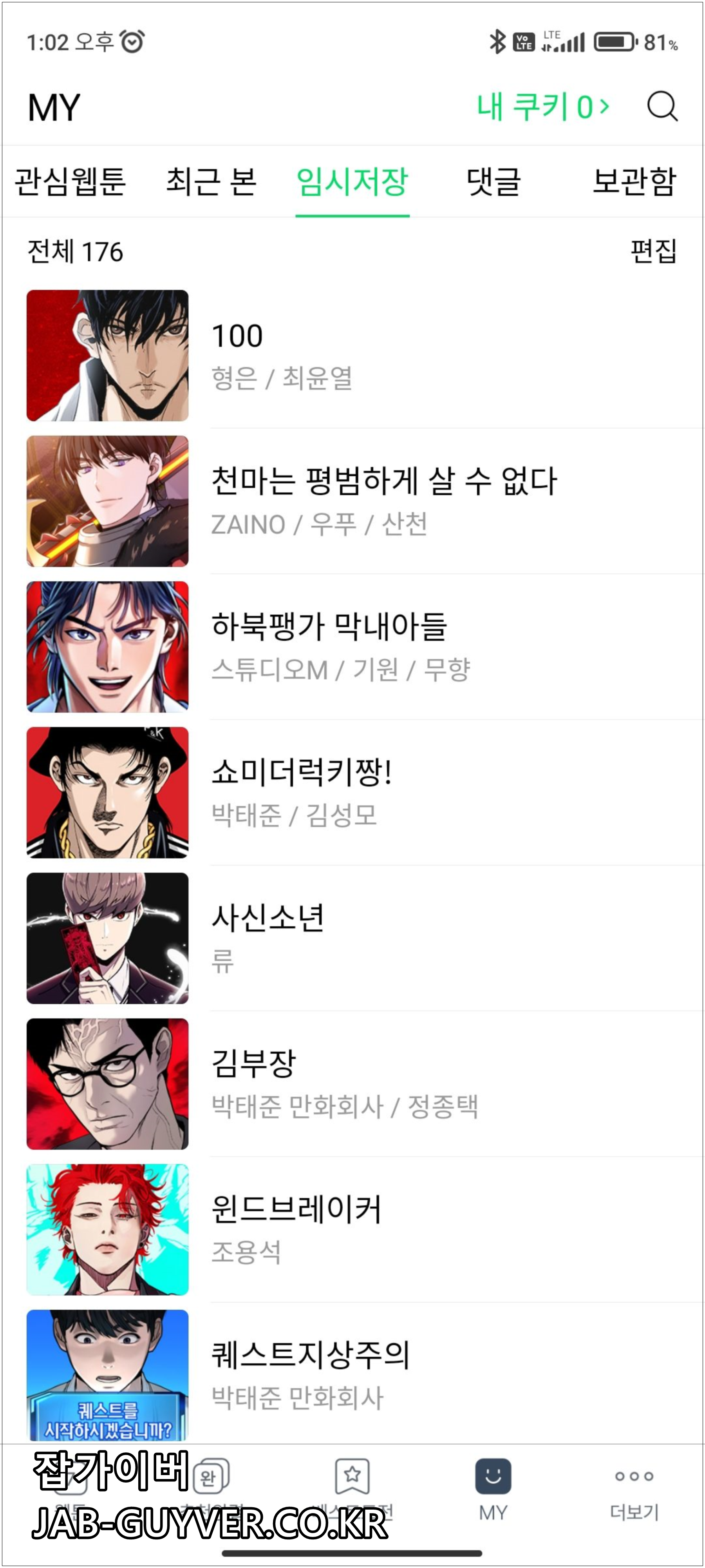네이버의 웹툰을 모바일데이터로 보게 되면 인터넷 데이터소모가 크기 때문에 저같은 경우는 지하철이나 버스에 타기 전 집에서 와이파이가 되는고에서 미리 네이버웹툰 임시저장을 하고 나옵니다.