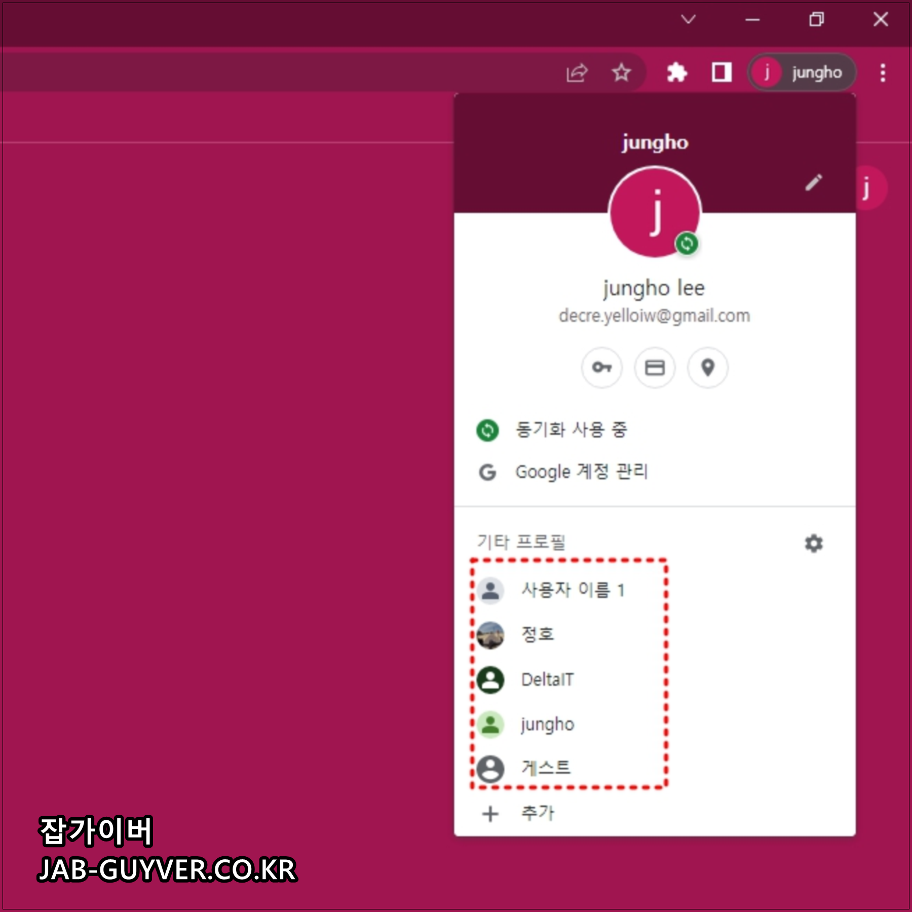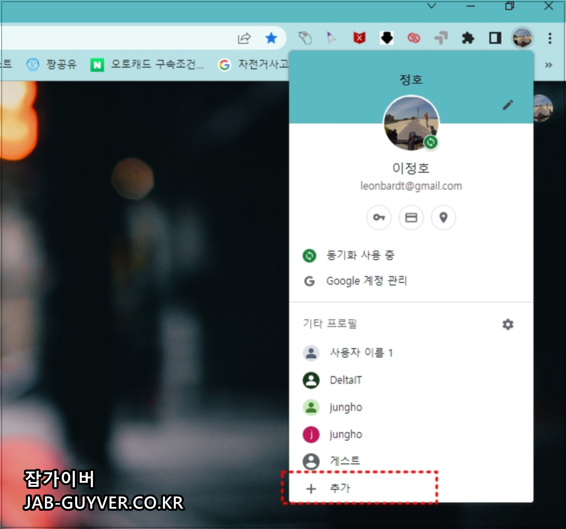 크롬에서 계정을 추가하고 변경하는 방법은 우측 상단 계정아이콘을 통해 추가 및 변경이 가능합니다.