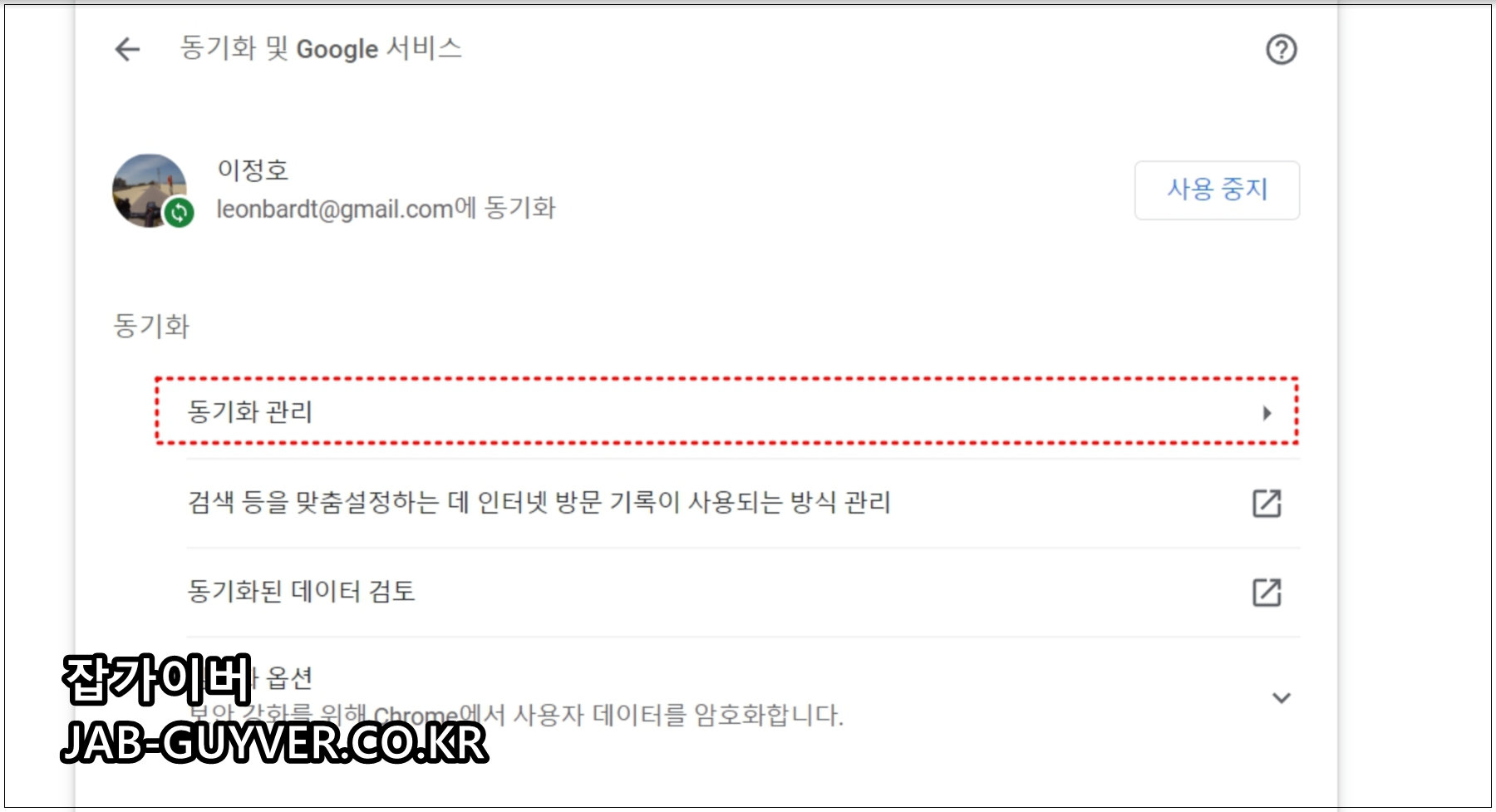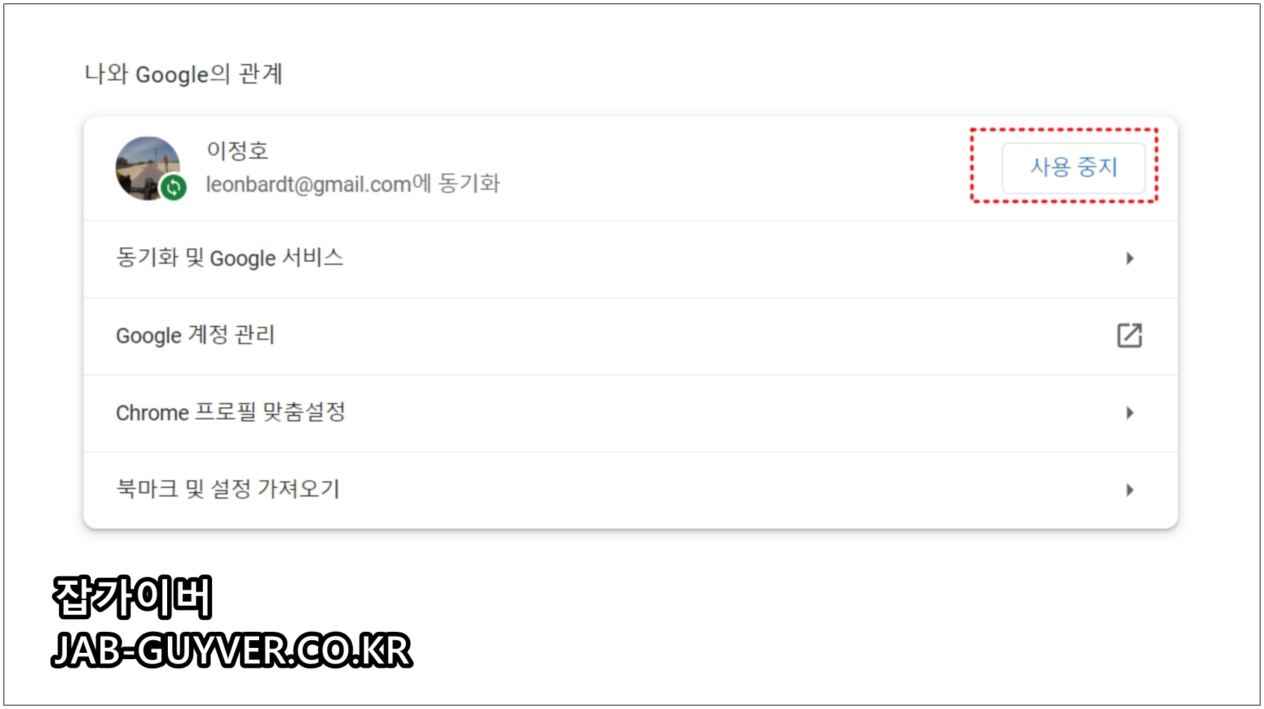 현재 로그인된 크롬의 구글계정을 확인할 수 있으며 사용중지를 통해 구글계정을 로그아웃합니다.