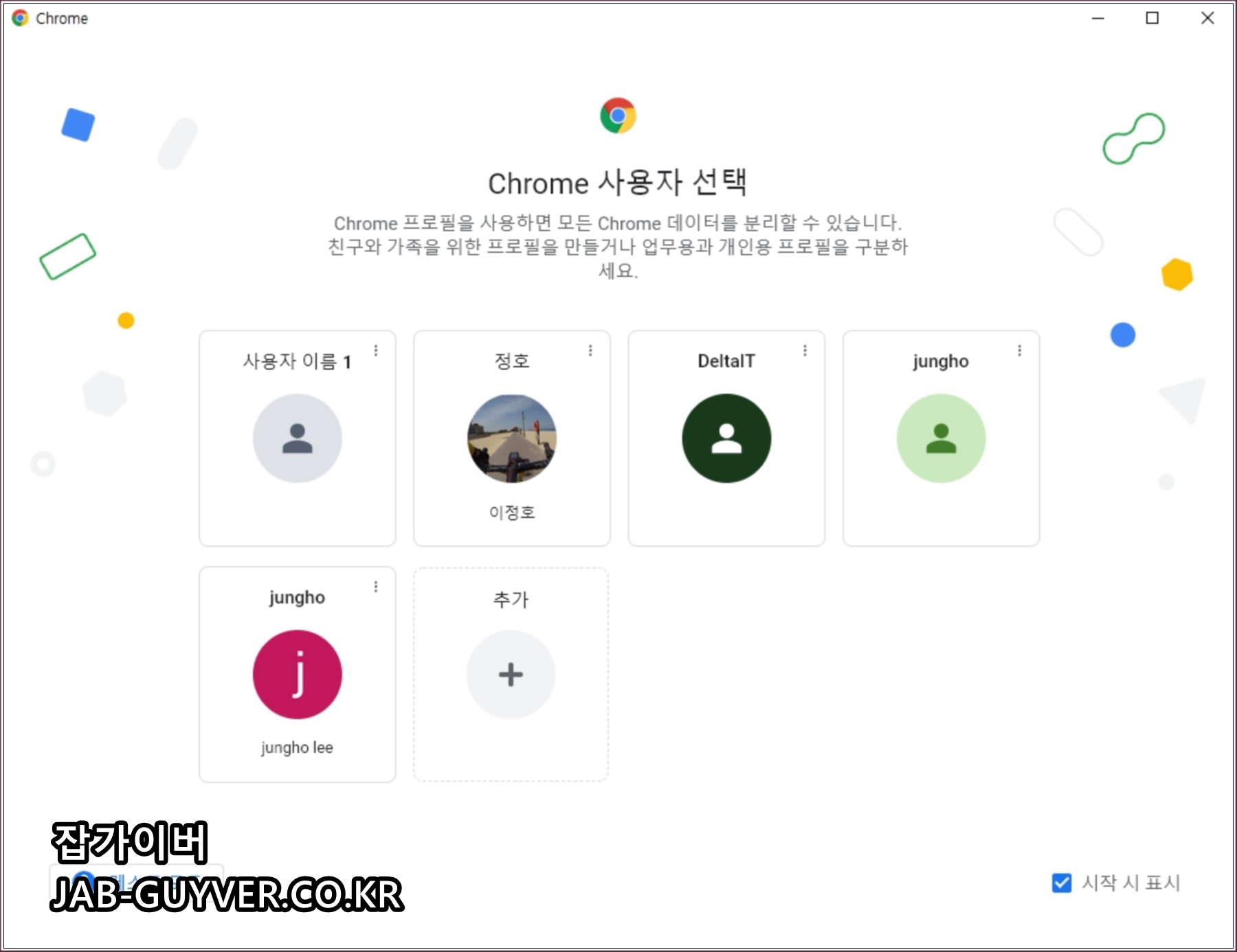 크롬을 처음 실행 시에도 원하는 계정으로 바로 접속할 수 있으며 게스트모드로 접속 시에는 쿠키나 캐시가 저장되지 않은 상태로 인터넷 쇼핑이 가능합니다.