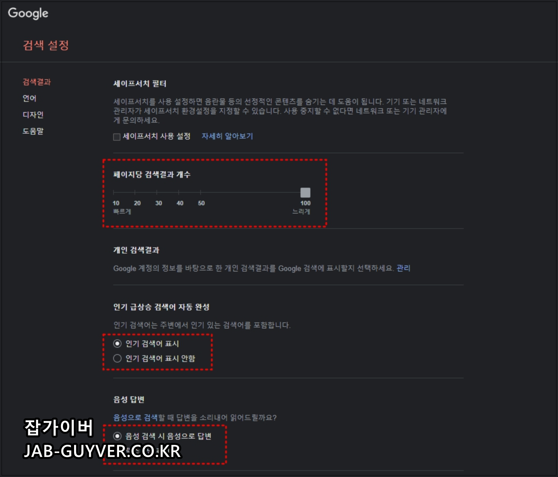 구글검색 시 페이지당 검색량을 한번에 많이 표시하고 싶다면 페이지당 검색결과 개수를 10 ~ 100개로 설정할 수 있습니다.