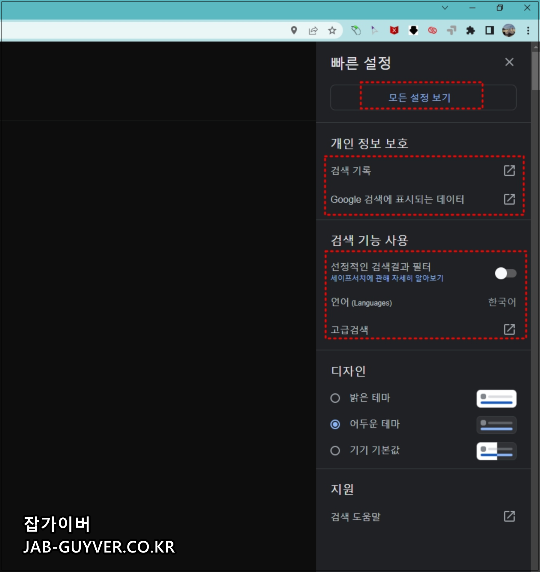 크롬 기어를 선택해 간단하게 크롬 내 검색기록 및 검색기능에 대한 필터링 다크테마, 밝은테마 등 디자인 변경이 가능합니다.