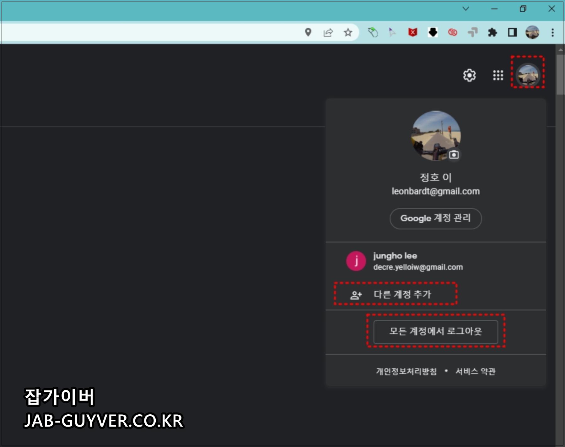 우측상단 계정으로 선택해서 다른계정 추가 및 모든 계정 로그아웃이 가능합니다.