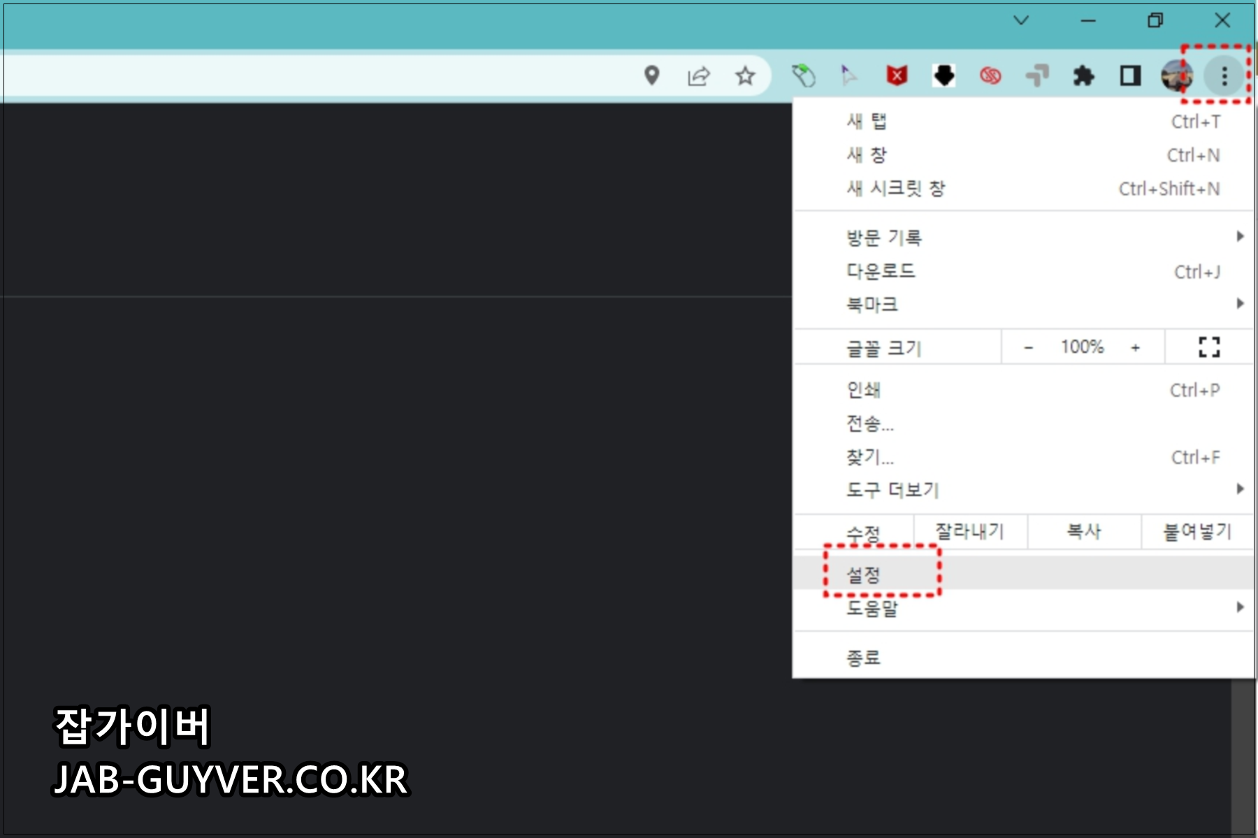 구글크롬을 실행 후 우측상단 점3개를 선택 설정으로 들어갑니다.