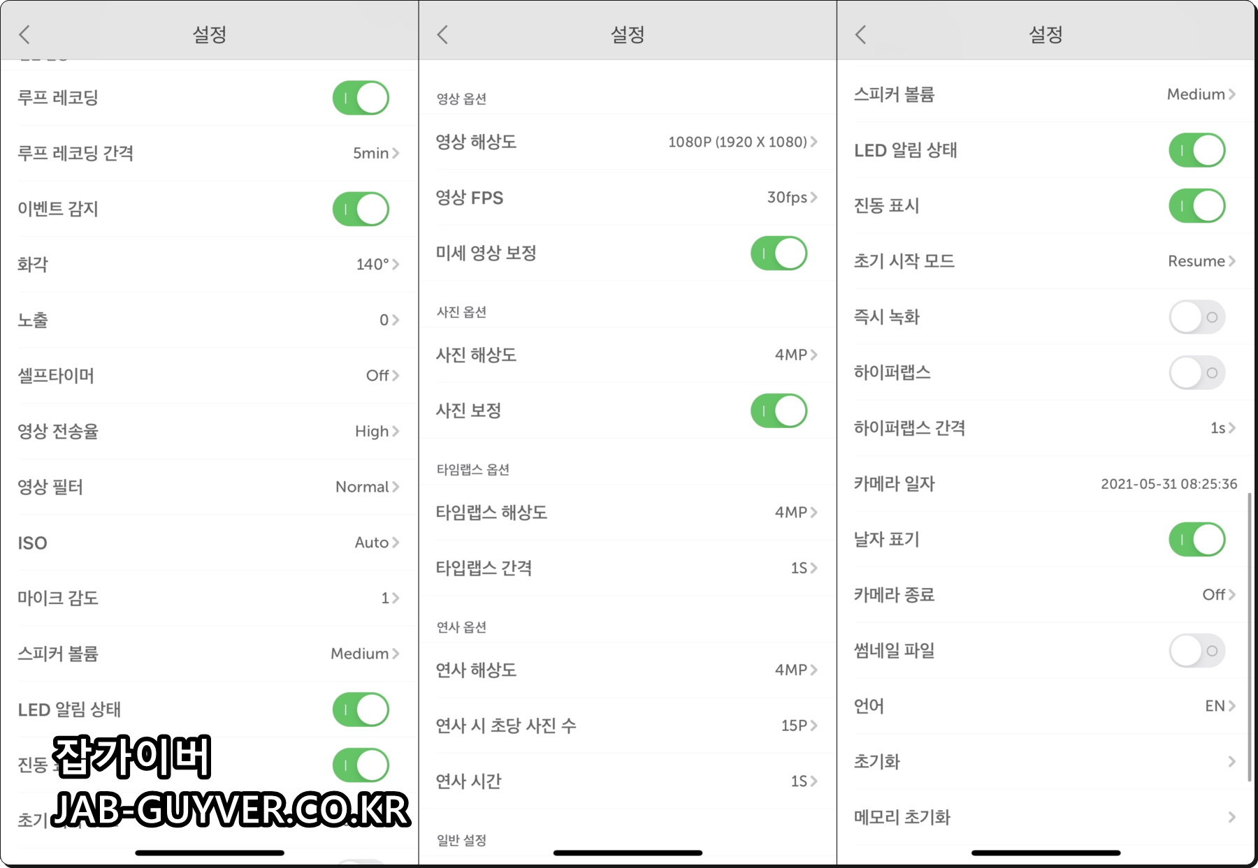설정을 통해 기본적으로 루프레코딩 및 루프레코딩 간격을 활성화할 수 있습니다.