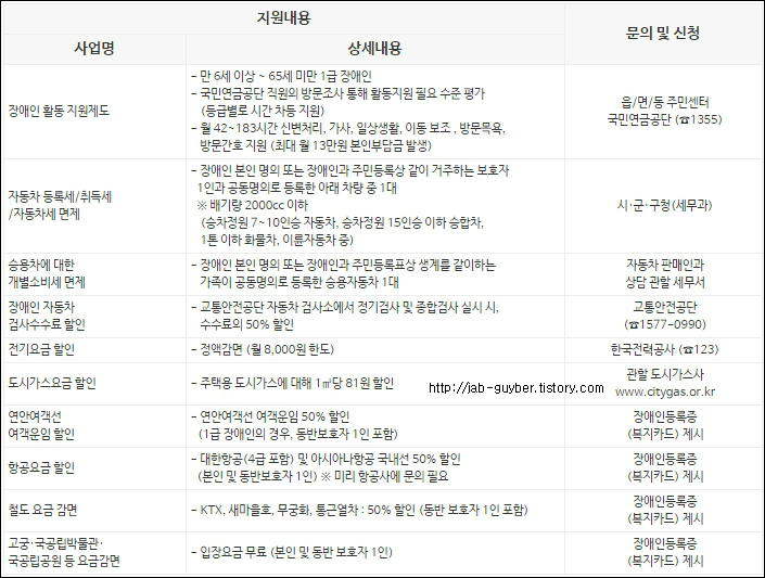 | 장애등급 지원 내용 | 문의 및 신청 | |