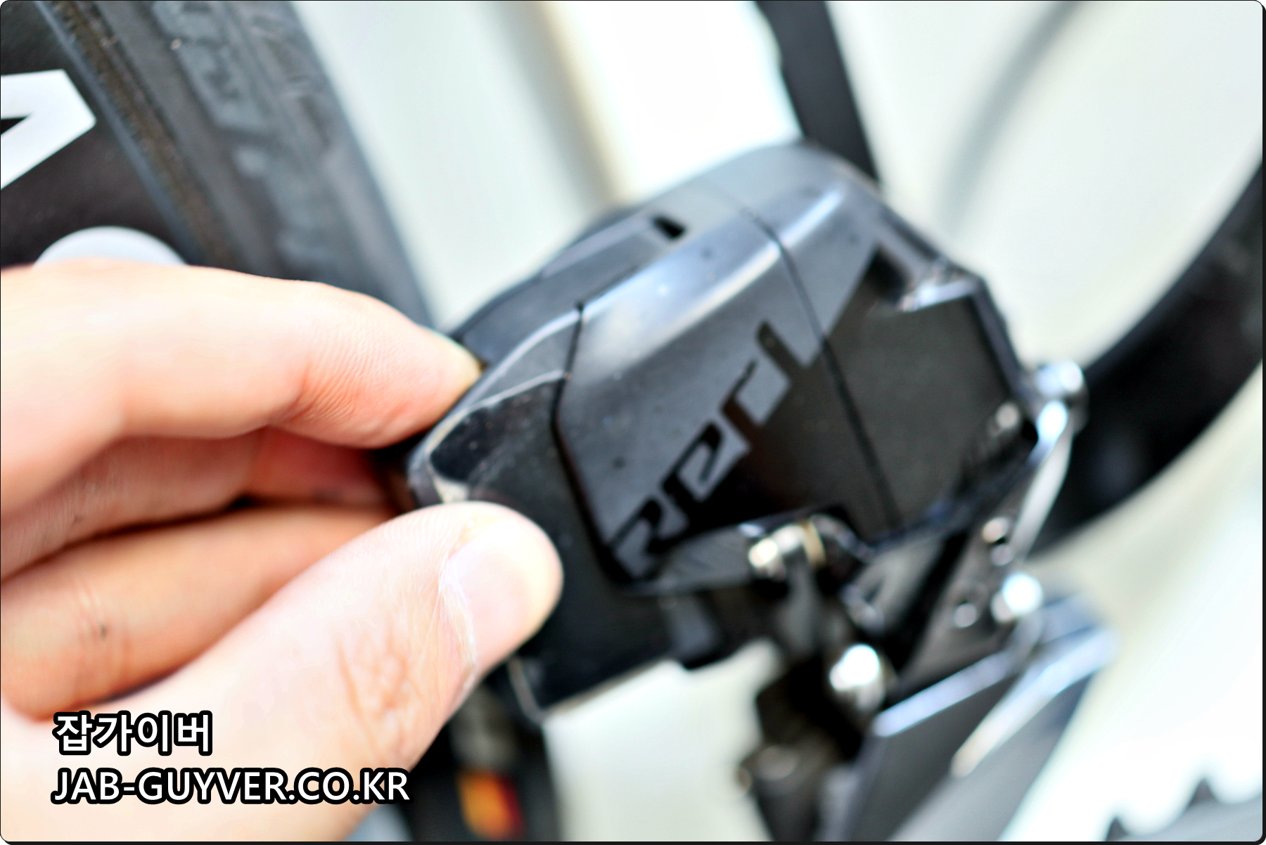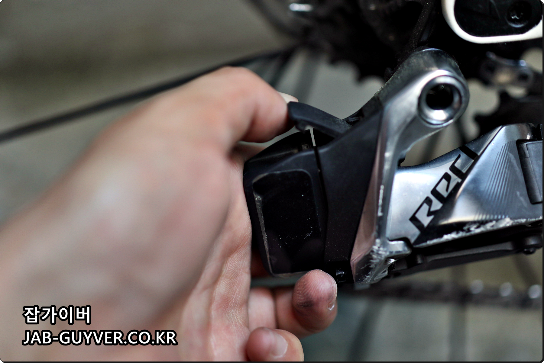 뒷드레일러의 스램 AXS RED 배터리를 제거하면 쉽게 분리됩니다.