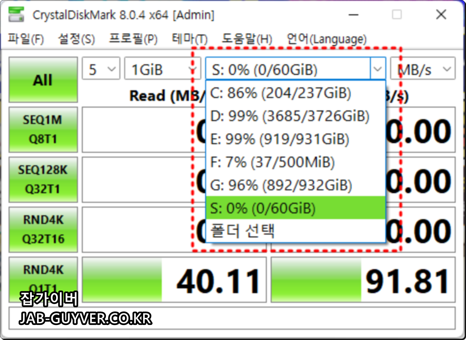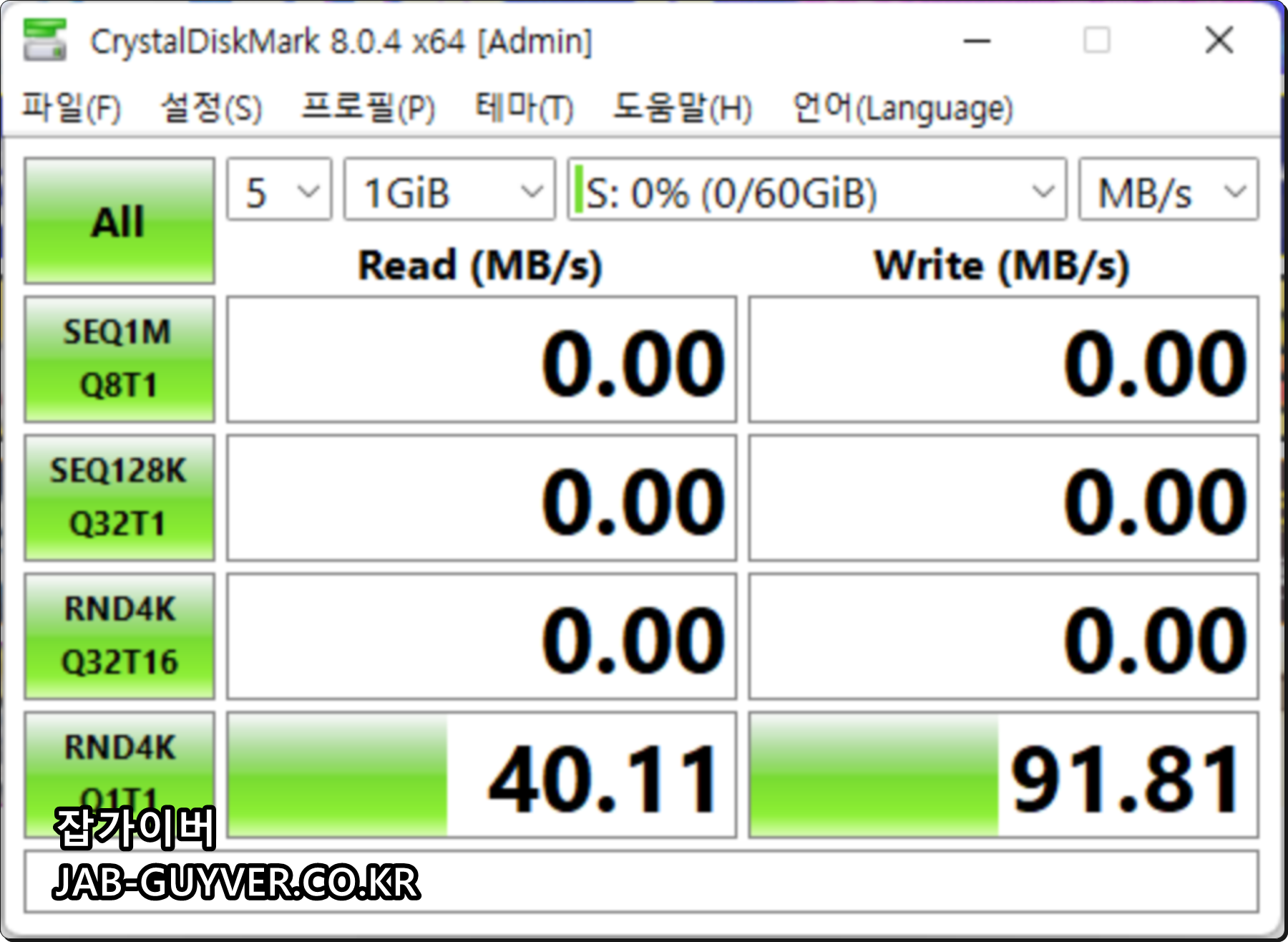 현재 1GB기준으로 읽기속도 40MB/s 쓰기속도 91MB/ 확인할 수 있습니다.