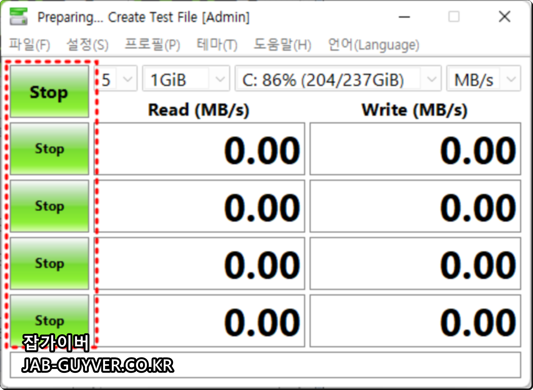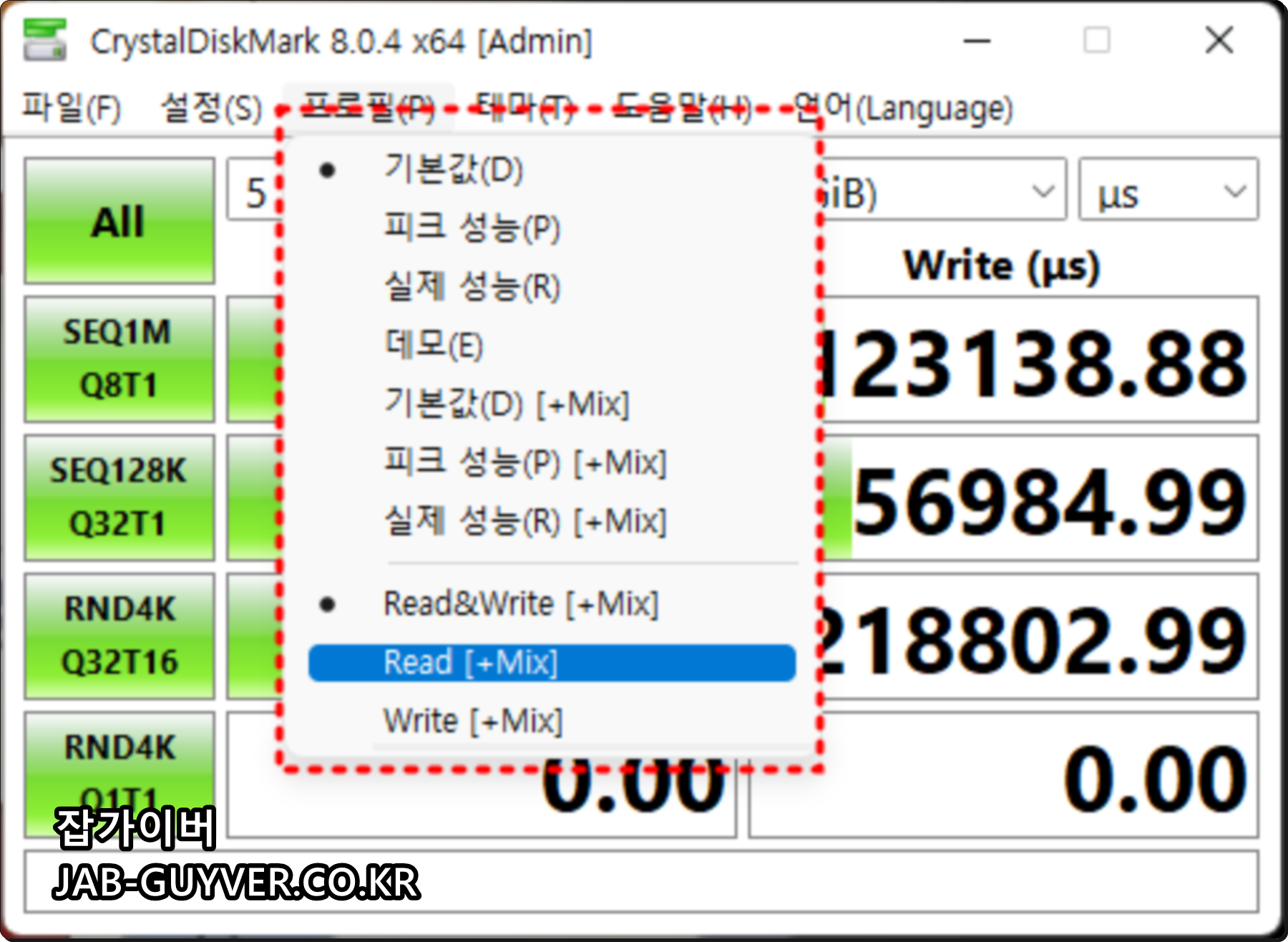 프로그램이 실행되면 현재 Read와 Write 읽기쓰기속도를 확인할 수 있으며 All을 눌러 모든 디스크속도를 측정합니다.