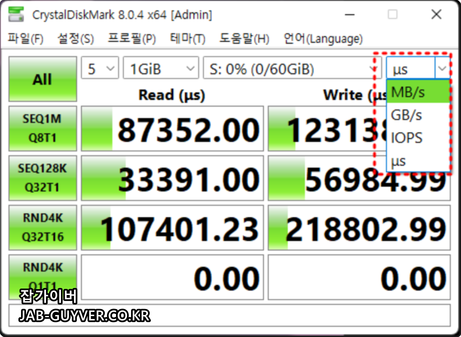 측정 시 단위로는 마이크로초 us, 기가바이트 GB, IOPS MB 단위로 확인할 수 있습니다.