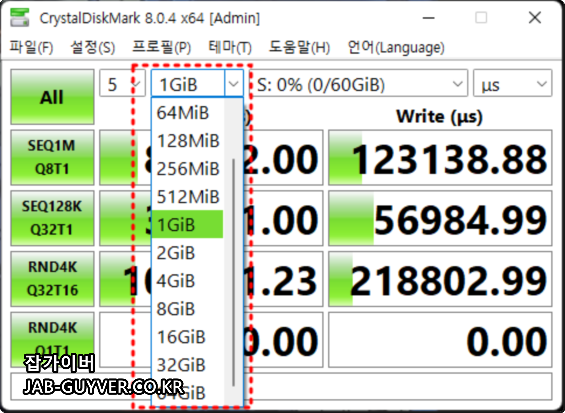 속도측정 시 데이터를 64,128,256,512,1GB,2GB 등을 정할 수 있으며 용량이 클수록 측정 시 시간이 오래걸리지만 보다 정확한 속도측정이 가능합니다.