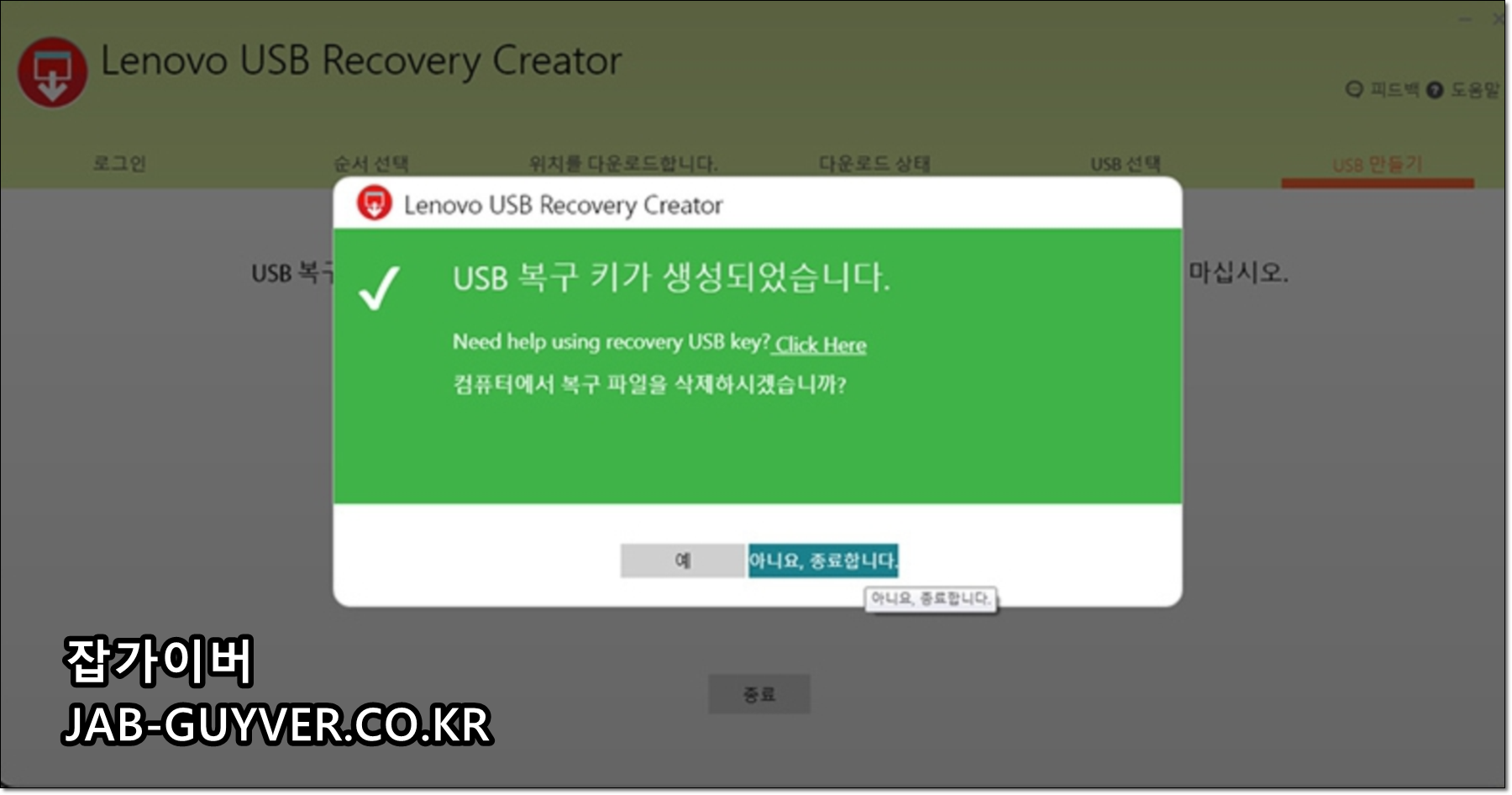 이후 레노버 백업 USB 복구파일이 저장이 완료되며 나중에 노트북 초기화 후 복구파일로 복원이 가능합니다.