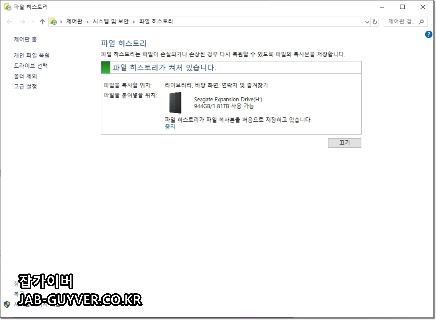 백업옵션에서 파일 히스토리를 활성화합니다.