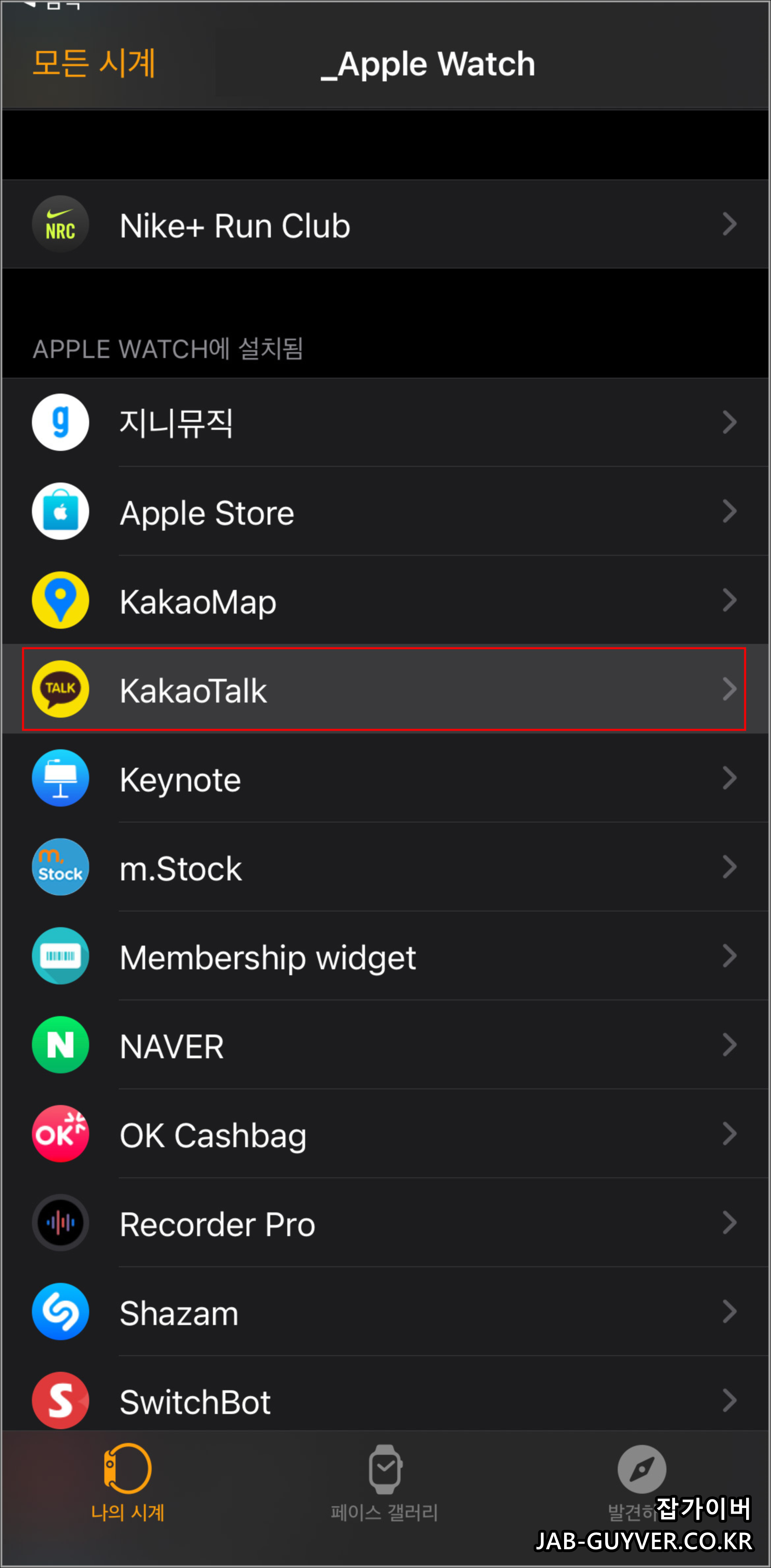 만약 이후에도 카카오톡 알림이 애플워치에서 울리지 않는다면 애플워치 알림에서 카카오톡을 체크합니다.