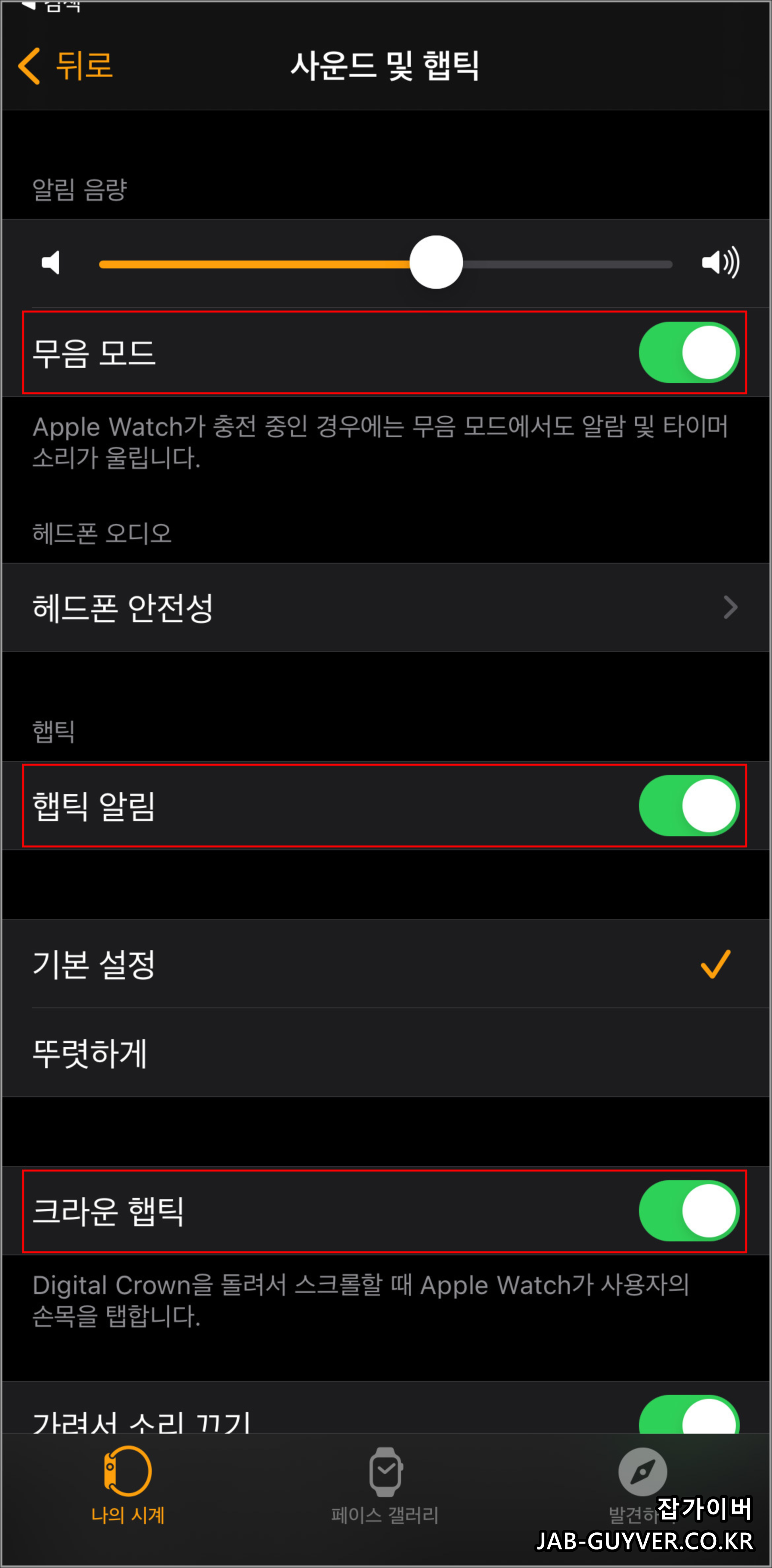 그 외에도 애플워치 무음모드에서 알람 및 햅팁알림, 크라운 햅팅 기능등을 활성화하고 싶다면 애플워치 앱에서 사운드 햅틱에서 무음보드 및 햅틱알림, 크라운햅틱을 각각 설정을 켜줍니다.