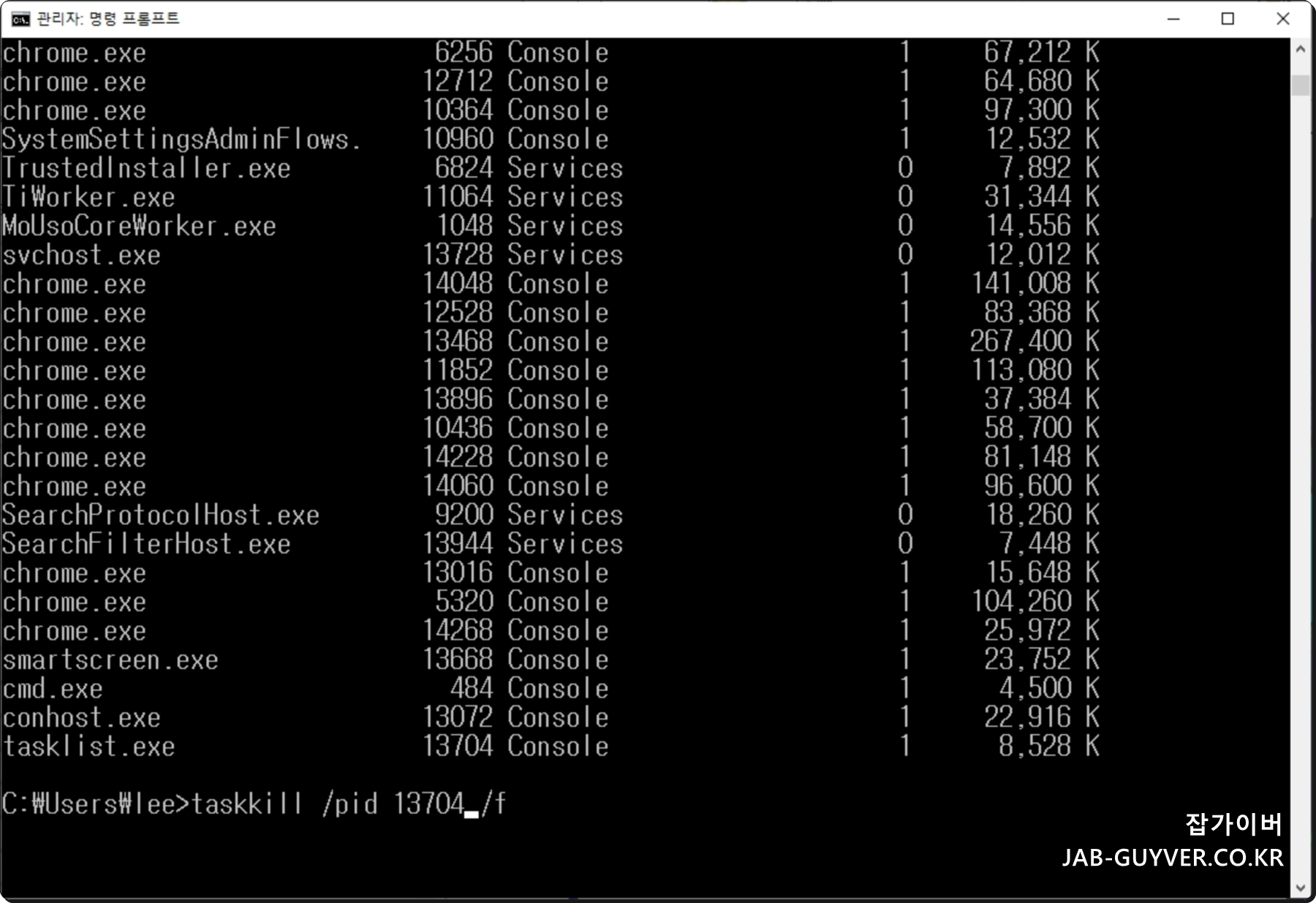 tasklist를 보면 이미지이름과 PID, 세션이름, 세션, 메모리사용량을 볼 수 있으며 이름이 아니라 PID값으로 ㅏㄱㅇ제종료도 가능합니다.