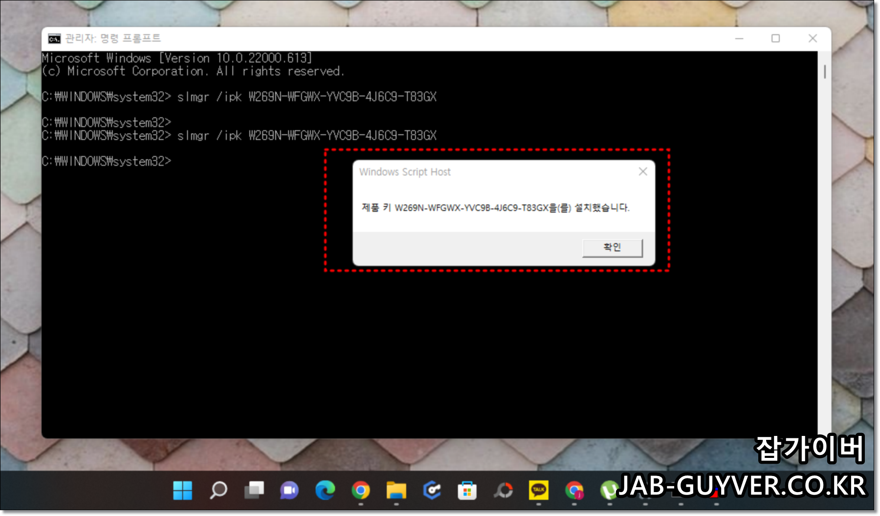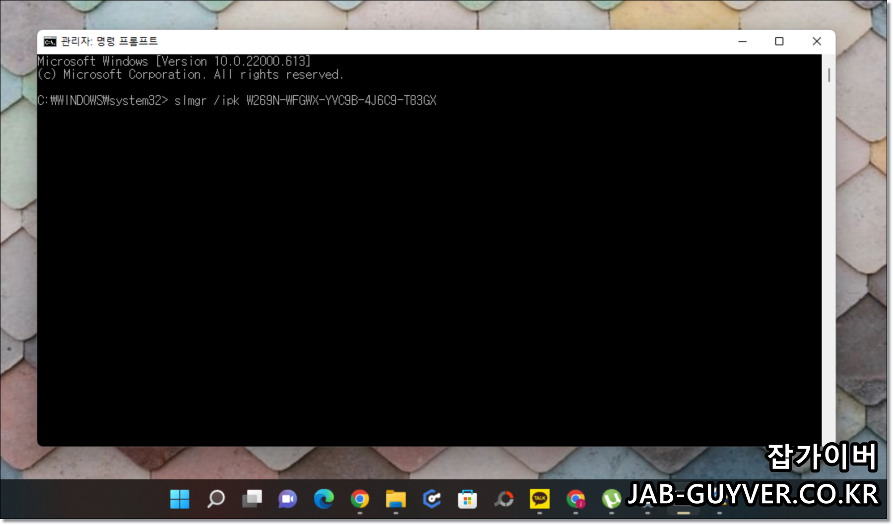 작은 도스창이 실행되면 현재 설치된 윈도우11 버전에 맞는 제품키를 입력합니다.