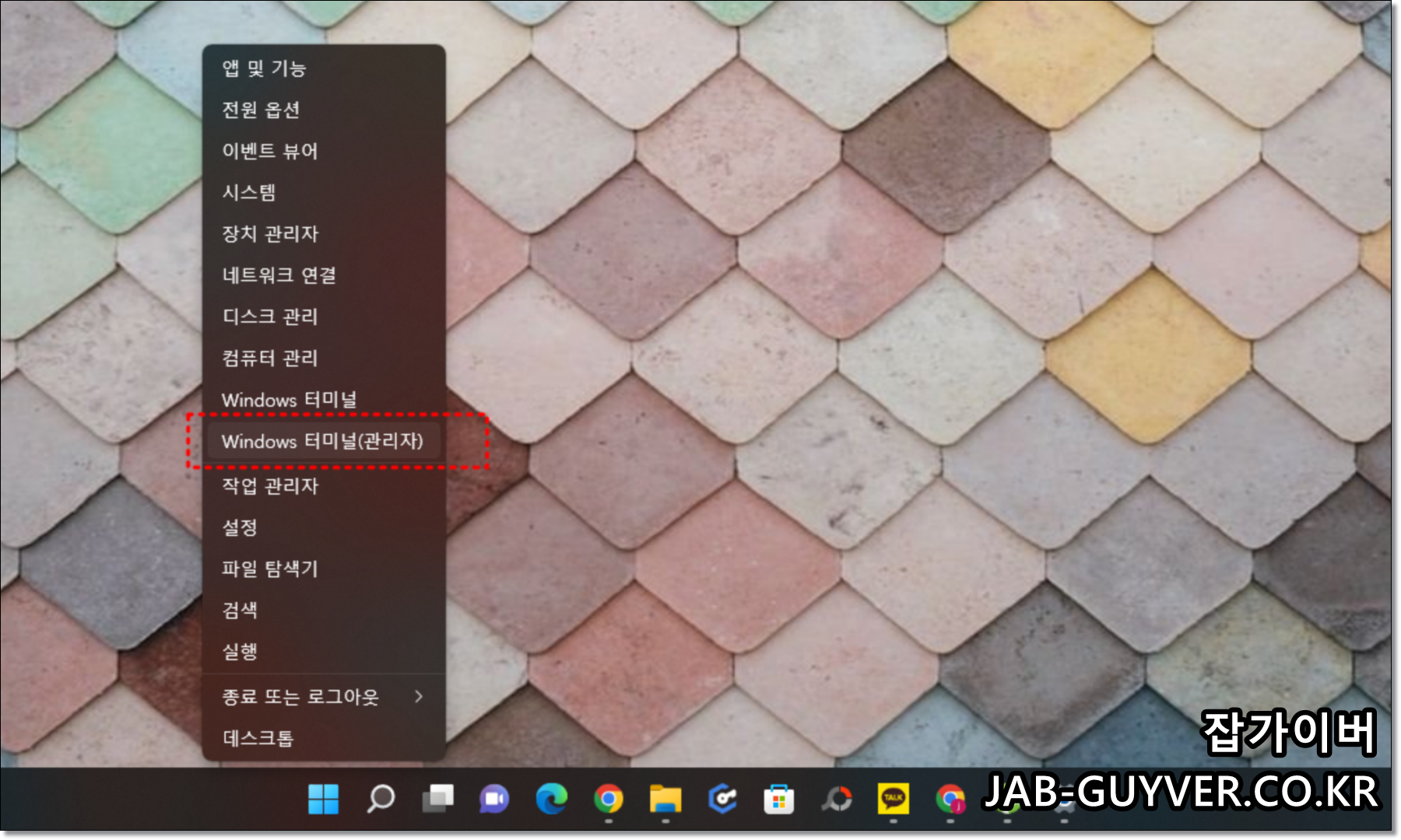 하단 작업표시줄 마우스 우클릭 후 Windows 터미널 (관리자)를 실행합니다.