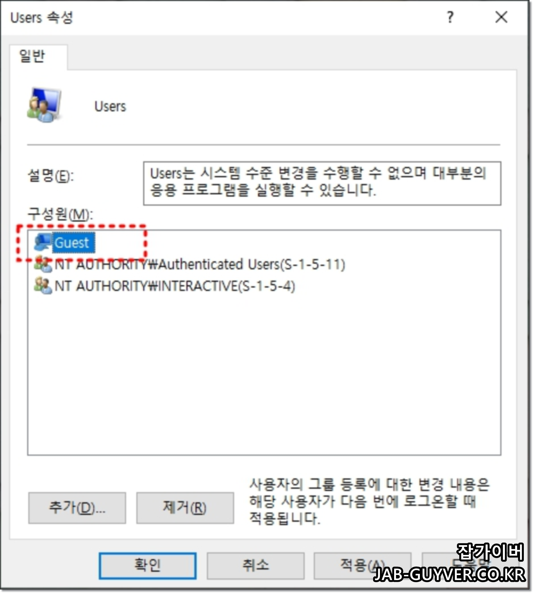 User 속성으로 들어가 추가를 눌러 Guest 계정을 추가합니다.