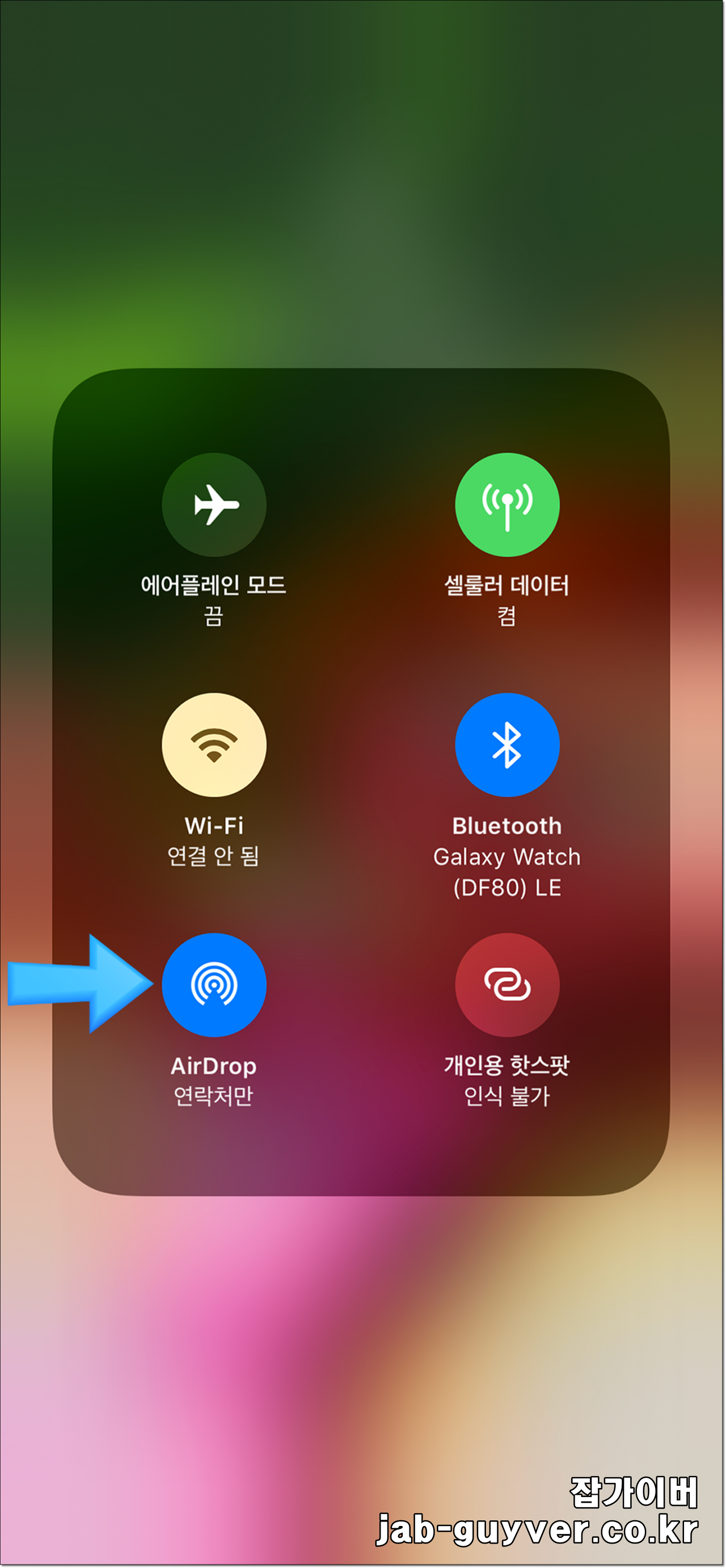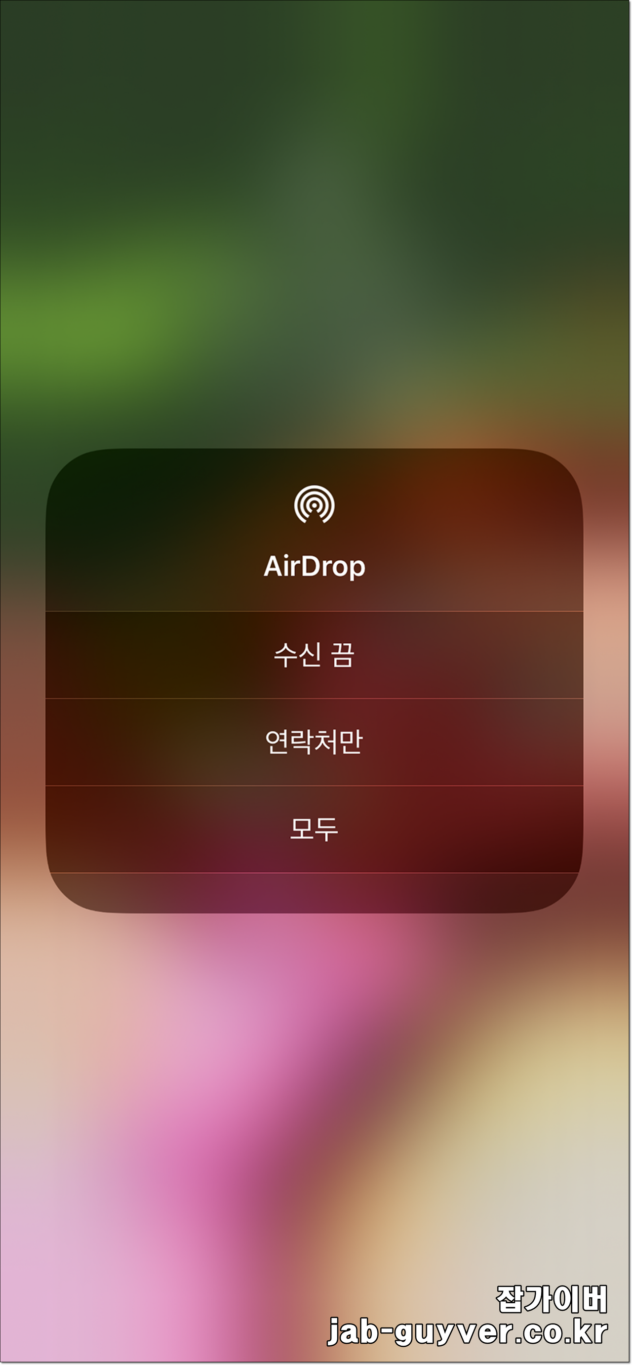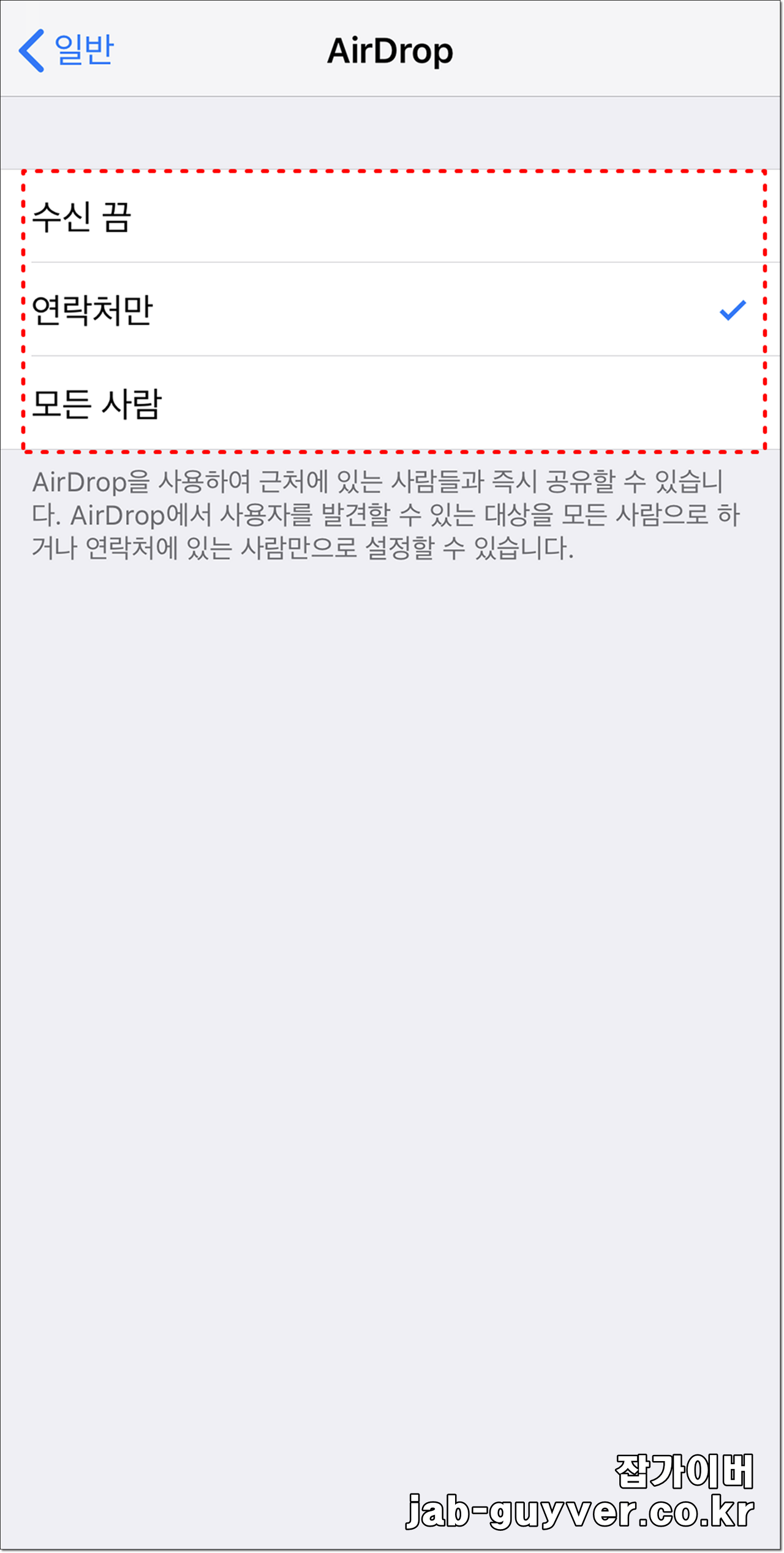 그리고 에어드랍 설정에서 수신 끔으로 설정되어 있는 것을 연락처만이나 모든 사람 둘 중 하나로 선택합니다.