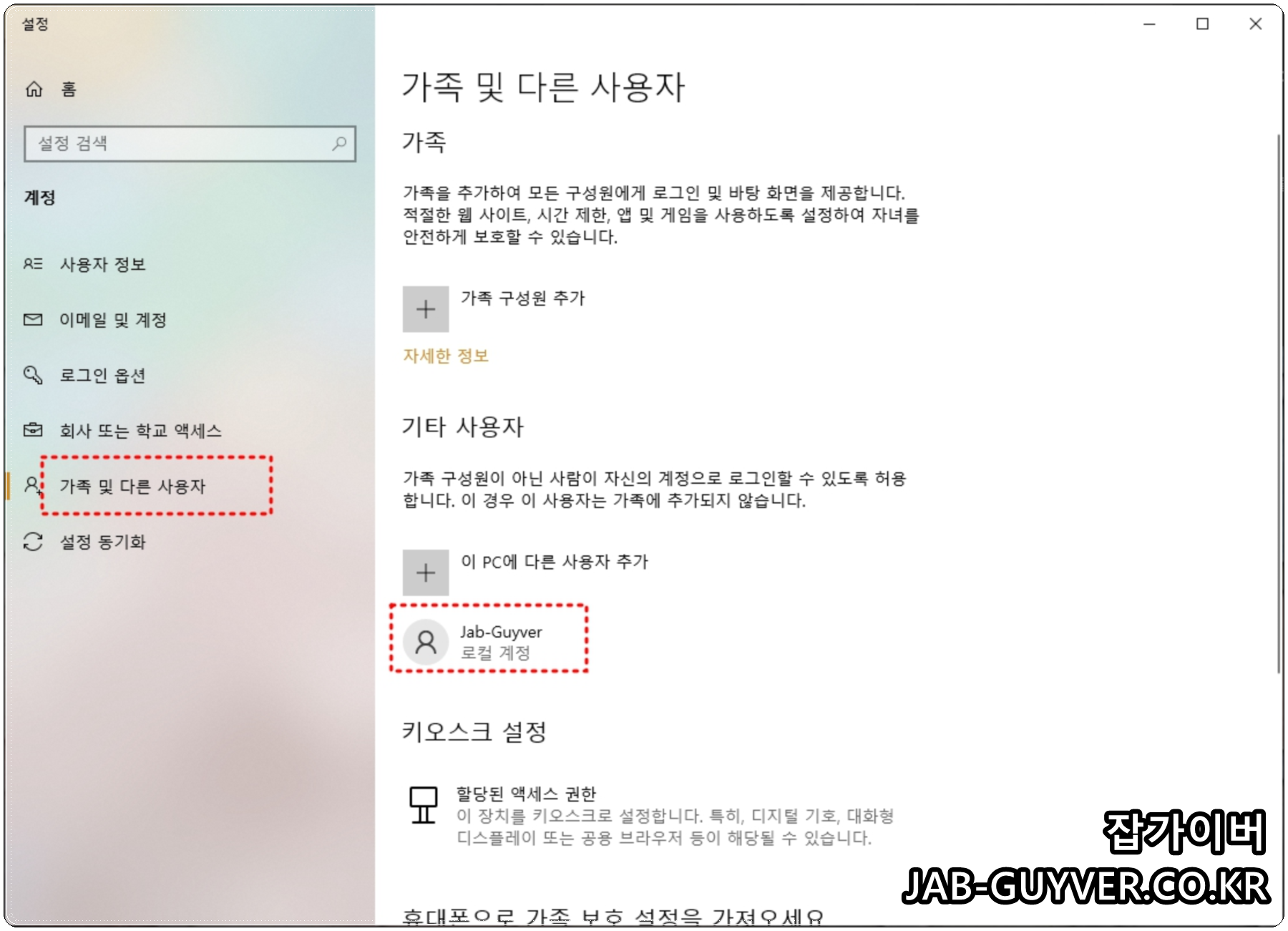 설정 화면에서도 “가족 및 다른 사용자”에서 방금 만든 로컬계정을 확인할 수 있습니다.
