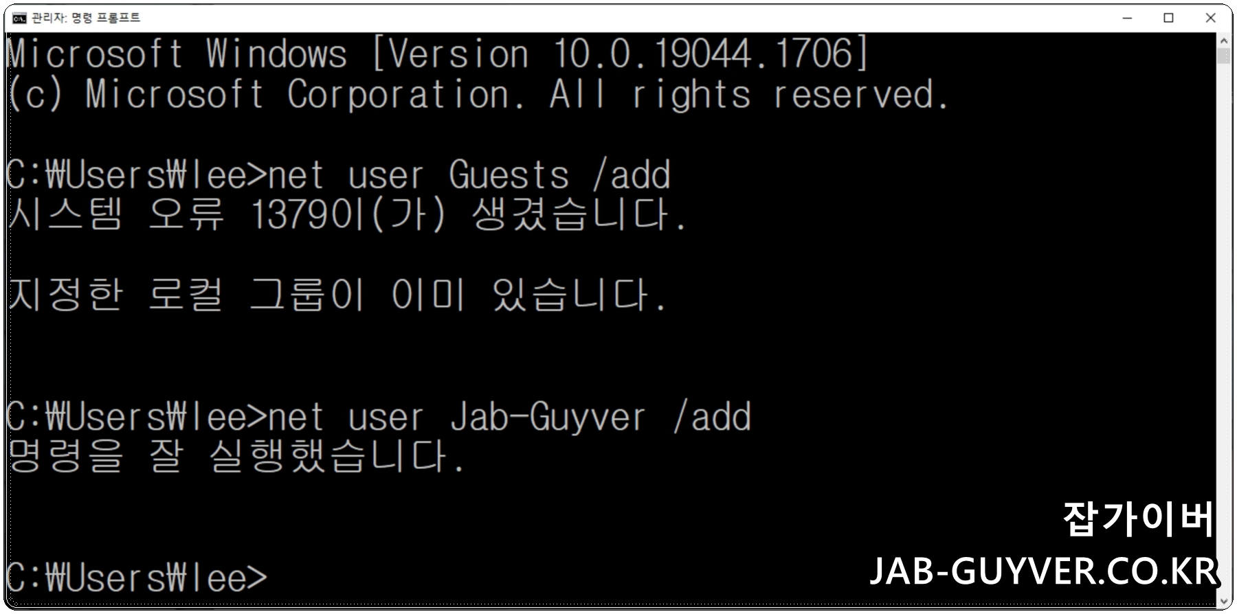 명령 프롬프트를 관리자 권한으로 실행합니다. 일반 권한으로 열면 계정 생성이 막히는 경우가 있고, 관리자 계정으로 로그인한 상태면 보통 문제 없이 진행됩니다.