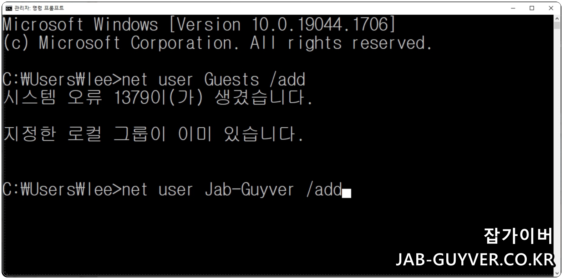 명령 프롬프트를 관리자 권한으로 실행합니다. 일반 권한으로 열면 계정 생성이 막히는 경우가 있고, 관리자 계정으로 로그인한 상태면 보통 문제 없이 진행됩니다.