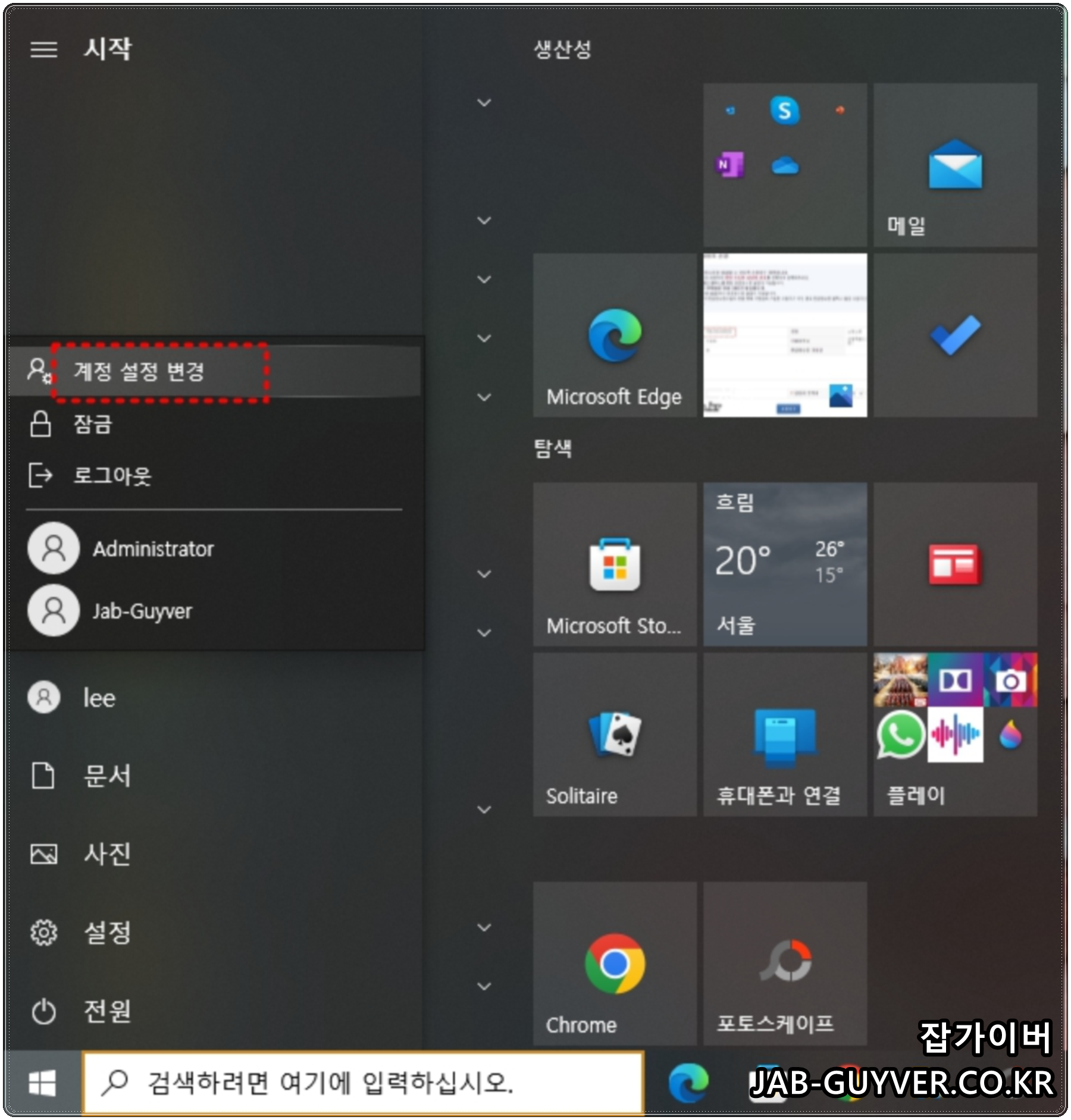 윈도우 검색창에 계정 관리를 검색해서 실행합니다.