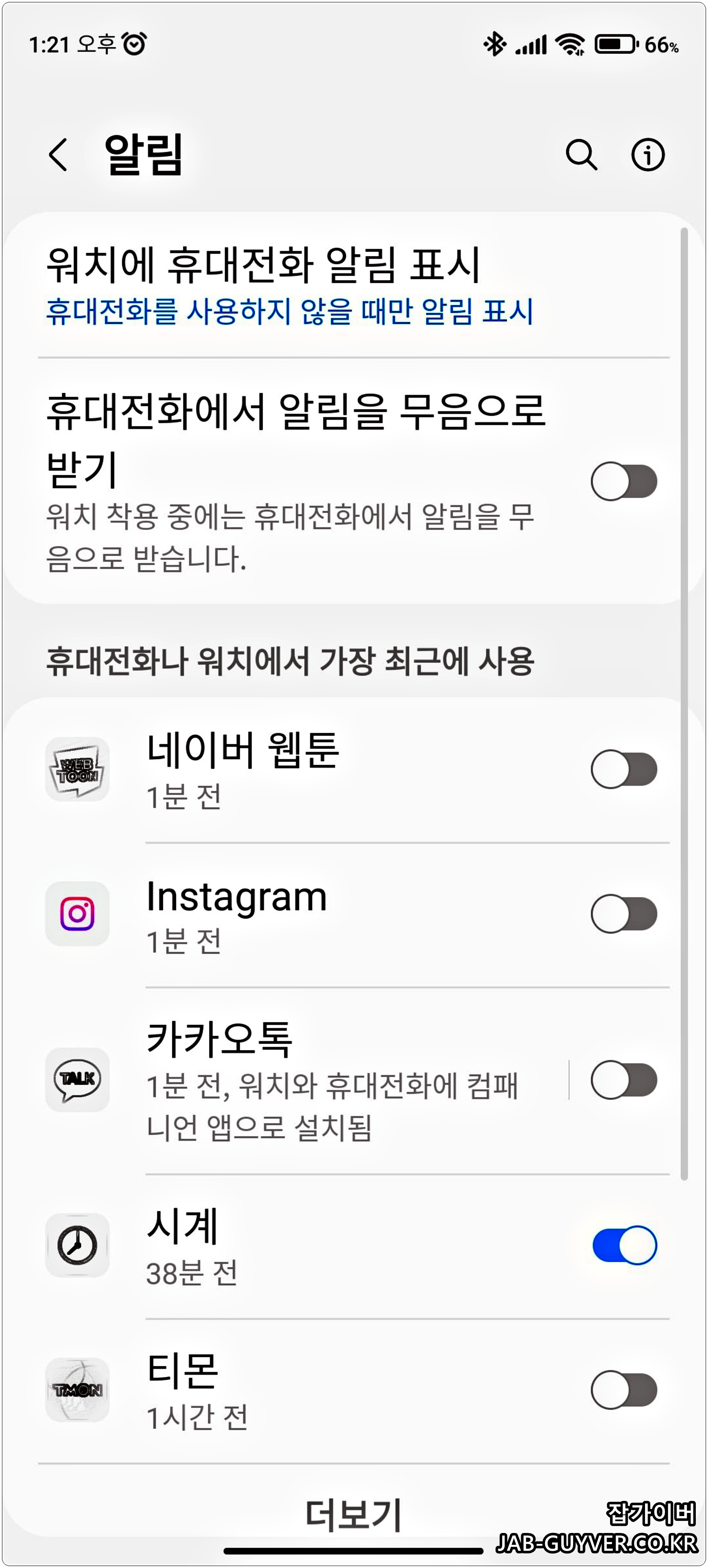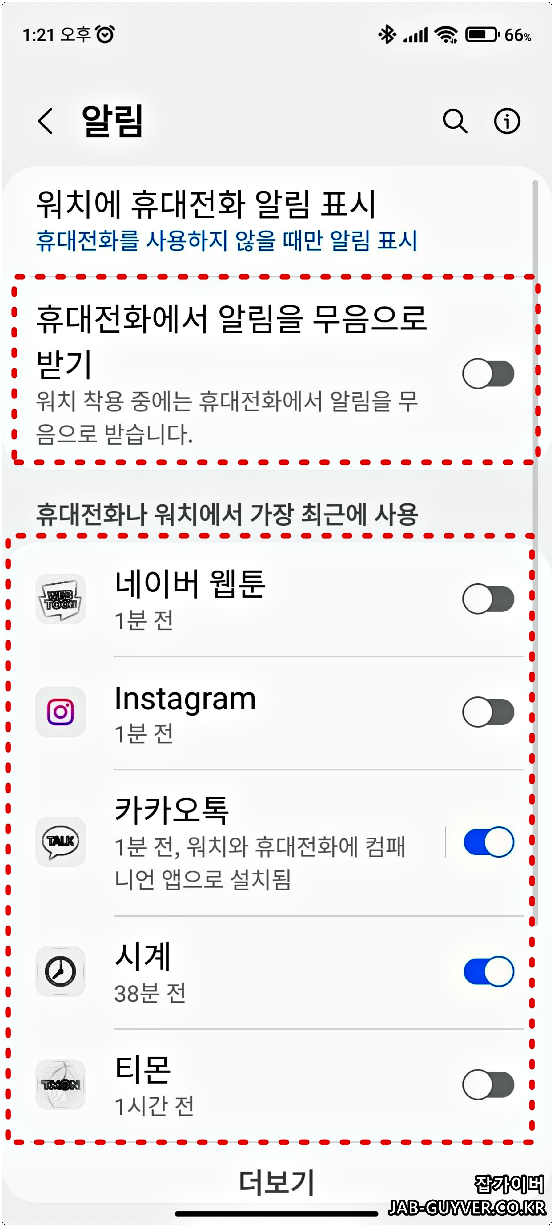 갤럭시워치4 카카오톡 알림끄기 및 활성화