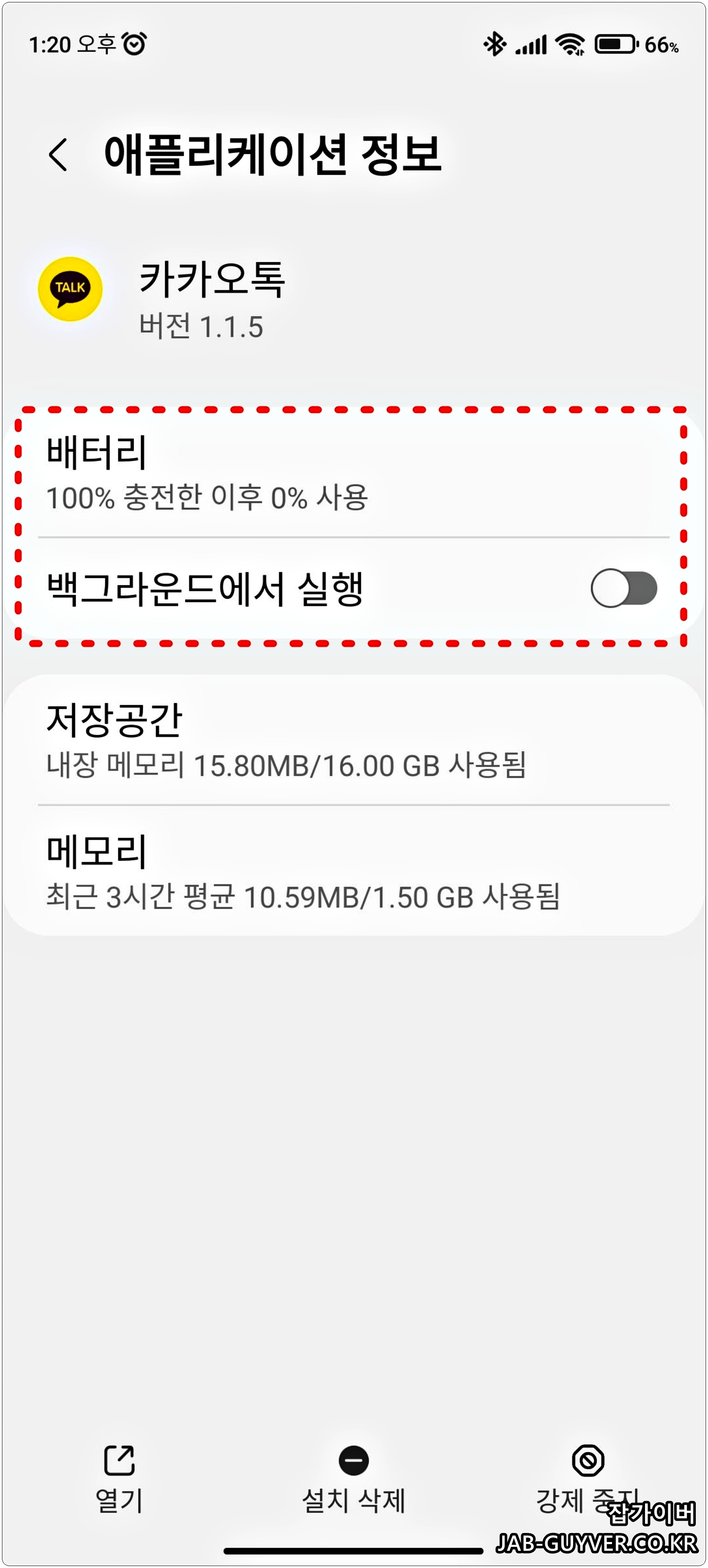 애플리케이션 카카오톡으로 들어가면 갤럭시워치에서 카카오톡 앱이 사용하는 배터리 소모량과 백그라운드에서 실행, 저장공간, 메모리등을 확인할 수 있습니다.