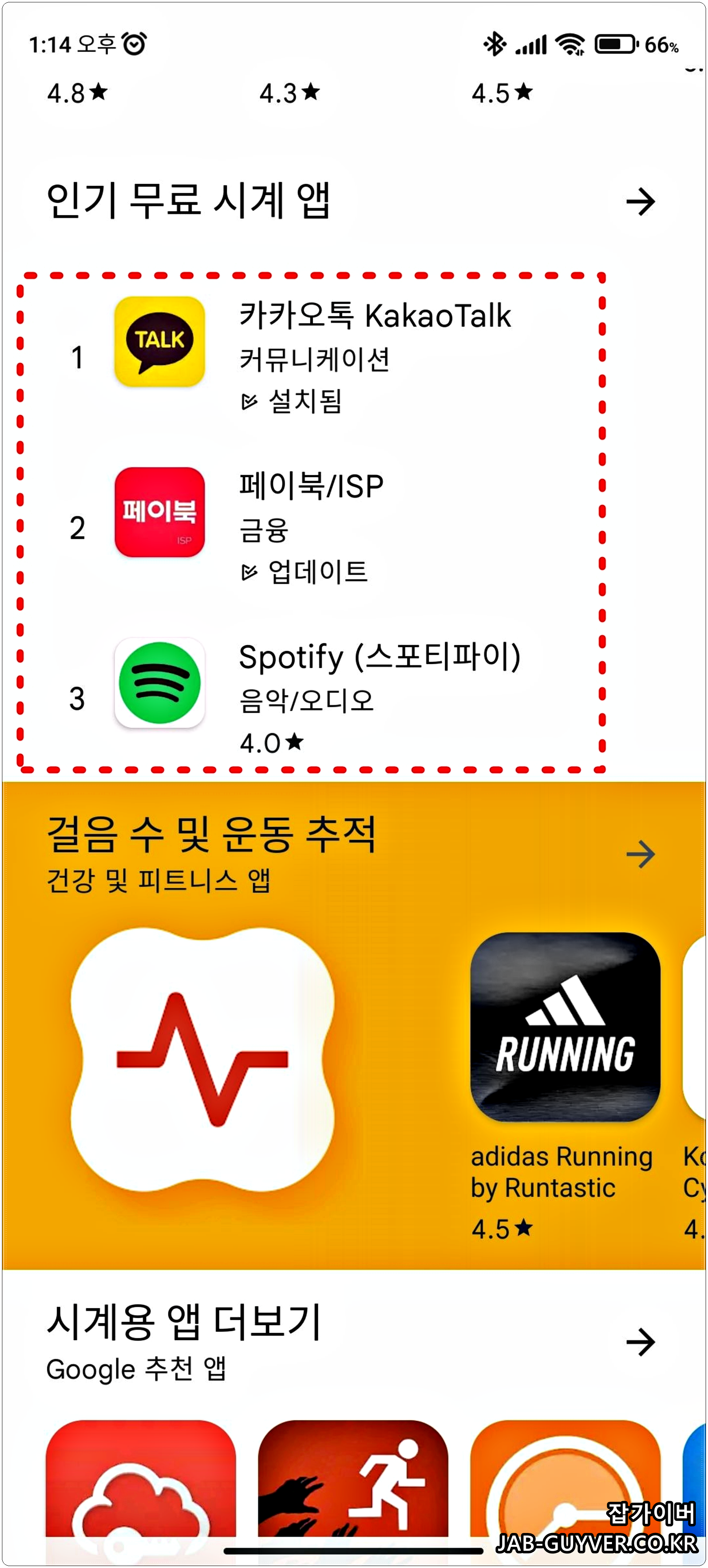 인기무료앱에서 카카오톡 및 페이북, 스포티파이 "음악"등의 앱을 설치합니다.