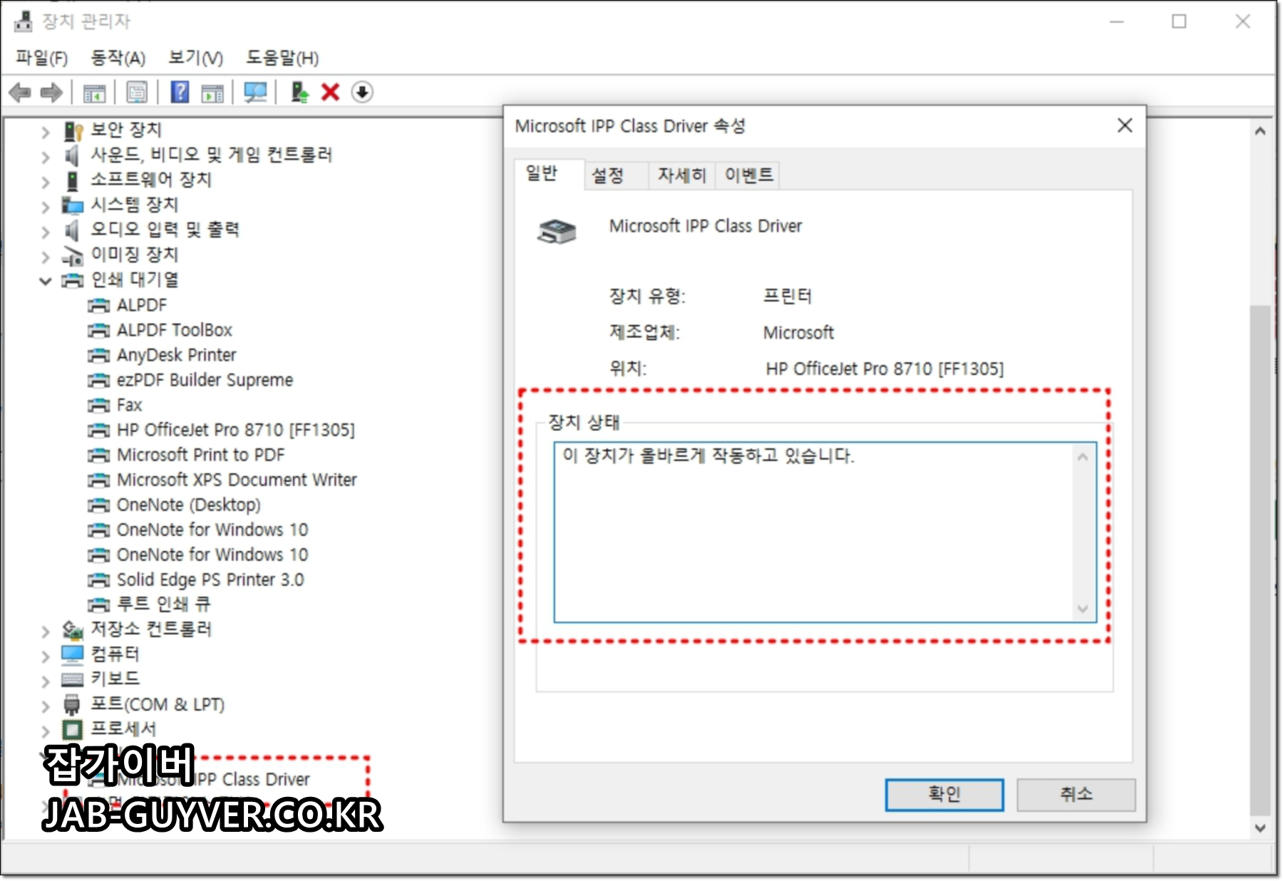 여기서 “이 장치가 올바르게 작동하고 있습니다”가 뜨는데도 인쇄가 안 된다면, 아래 단계로 넘어갑니다.
