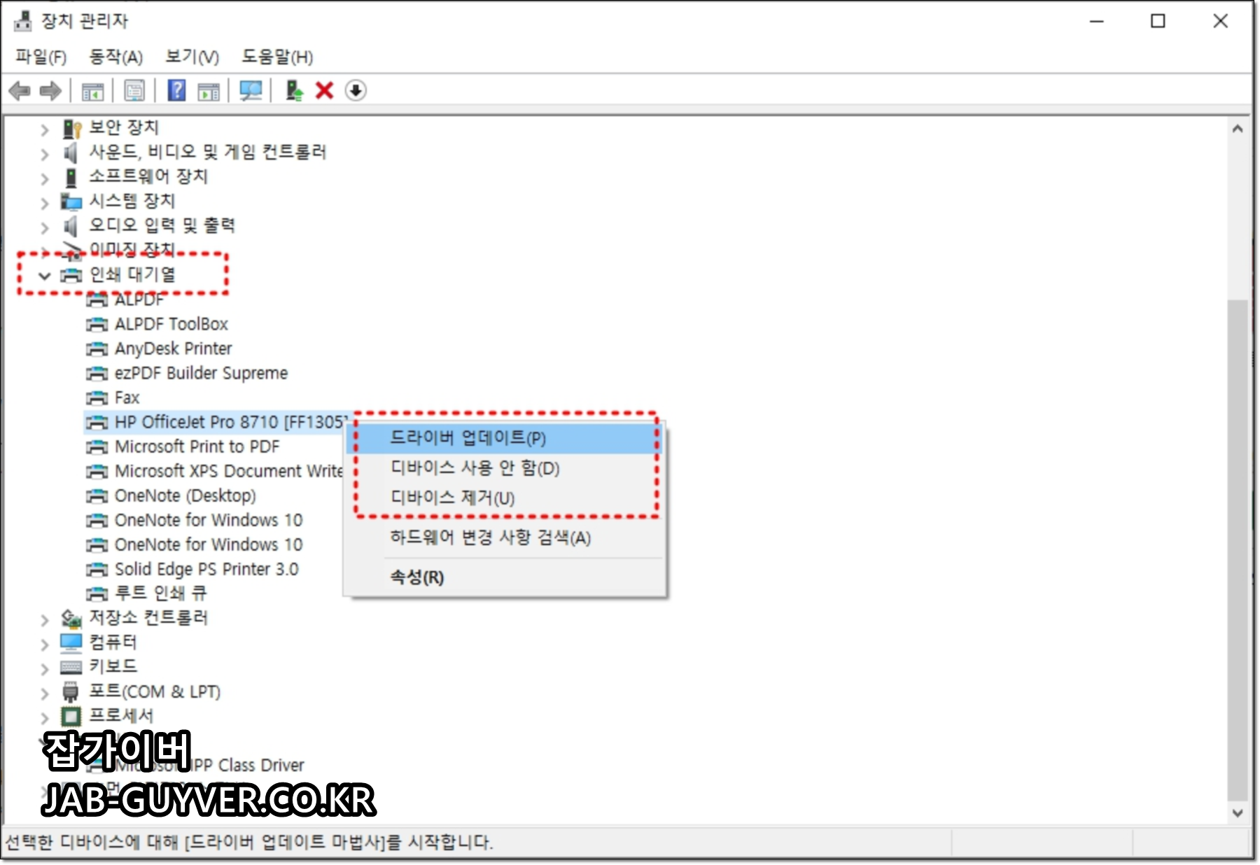 프린터 디바이스 삭제 및 드라이버 업데이트