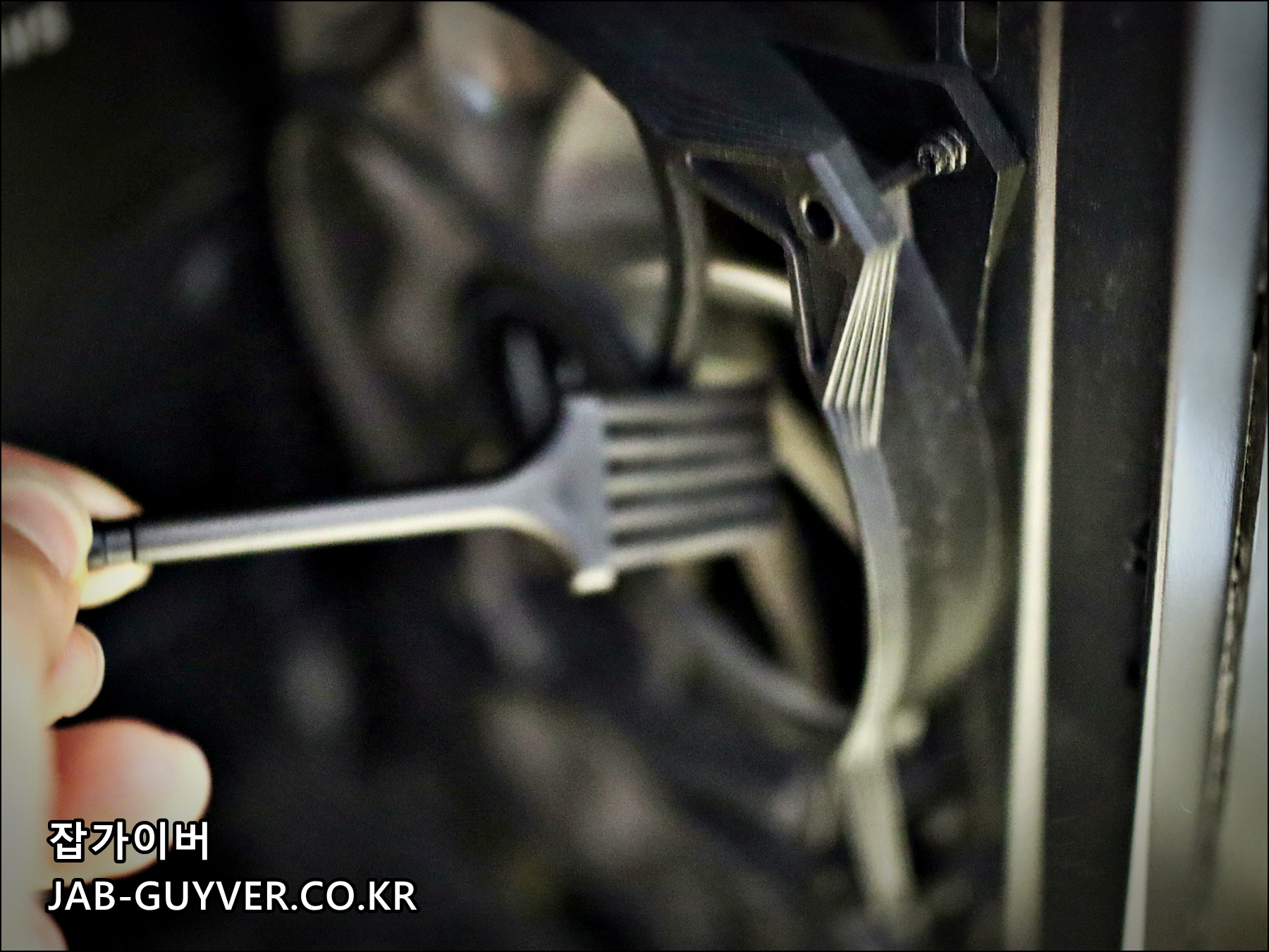 에어건만 써도 먼지는 어느 정도 날려보낼 수 있지만, 팬 블레이드에 붙어 있는 먼지 덩어리나 히트싱크 사이에 눌어붙은 먼지는 브러시가 훨씬 잘 떨어집니다. 가장 이상적인 조합은 브러시로 먼저 쓸어낸 뒤 에어건으로 마무리하는 방식입니다. 에어건을 쓸 때는 팬이 과하게 돌아가지 않도록 손가락이나 막대로 팬을 살짝 잡아주는 게 좋습니다.