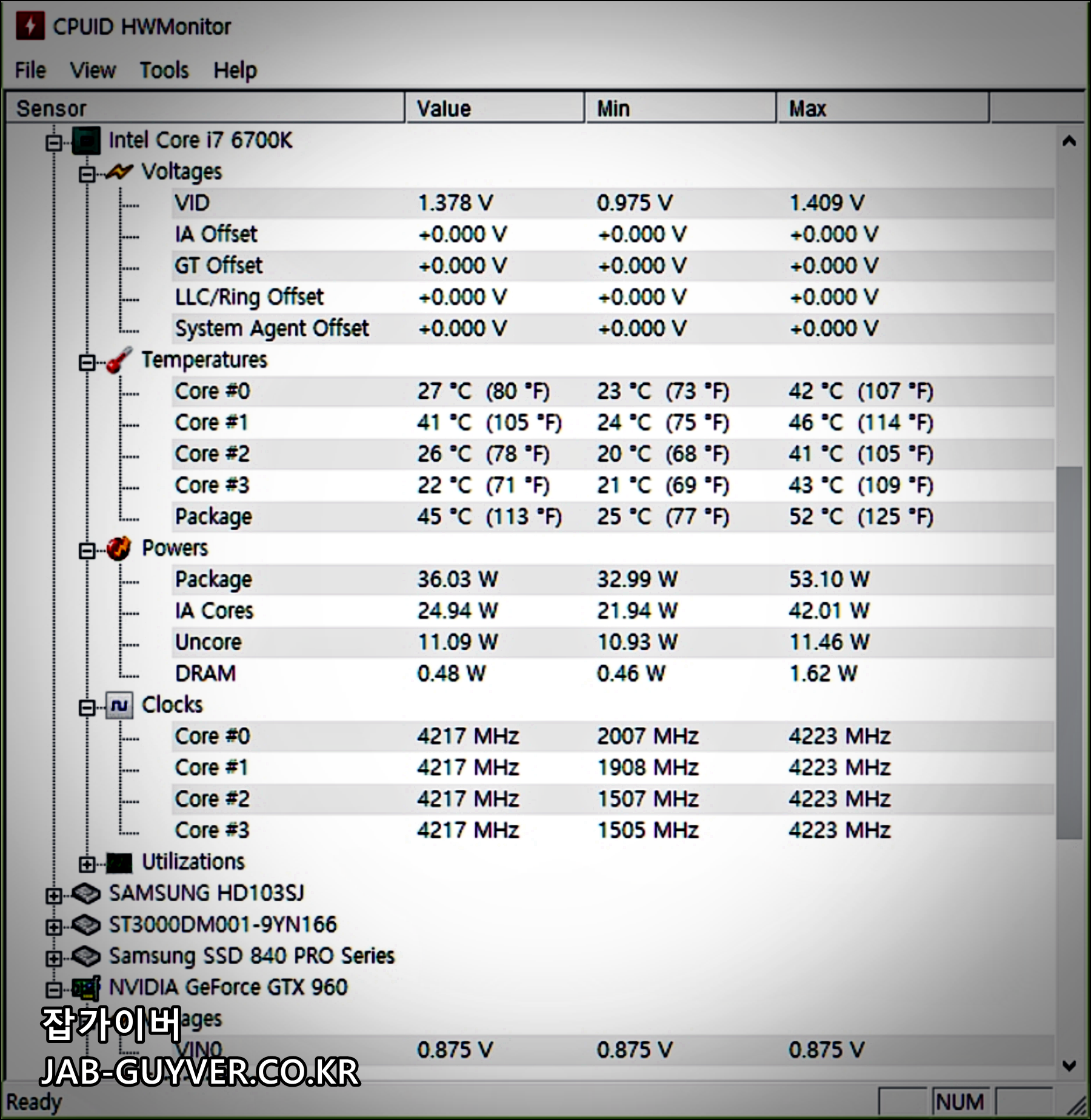 조립을 마치고 전원을 다시 넣었다면, CPUID HWMonitor 같은 모니터링 프로그램으로 CPU·그래픽카드·메인보드·스토리지의 온도를 확인해보면 청소 효과가 바로 눈에 들어옵니다. 먼지 제거와 써멀 재도포까지 해줬다면, 기존에 50도 안팎까지 올라가던 아이들 온도가 30도 내외로 떨어지는 경우도 흔합니다.