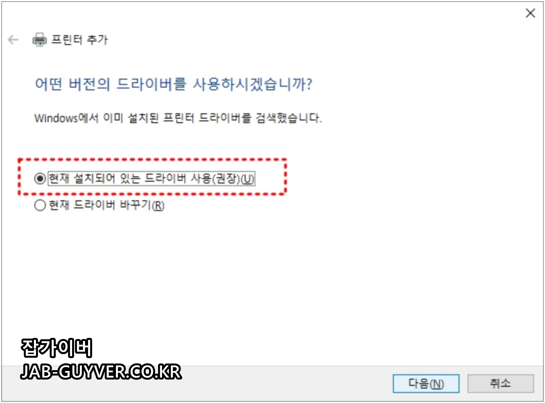 현재 설치되어 있는 윈도우 프린터 드라이버 사용을 권장합니다.