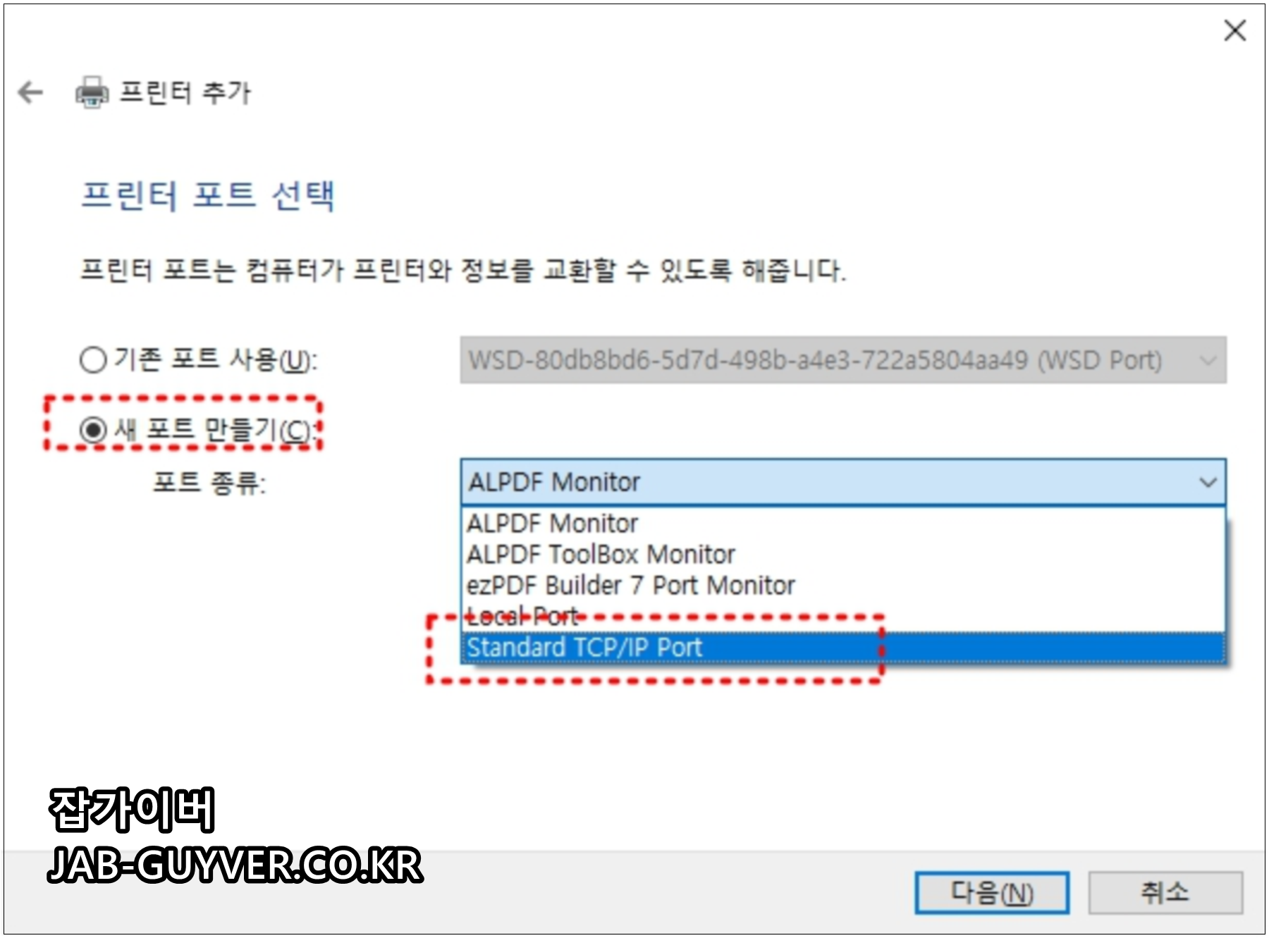 새 포트 만들기 -> Standatd TCP/IP Port를 선택한 다음 프린터 정보를 입력합니다.