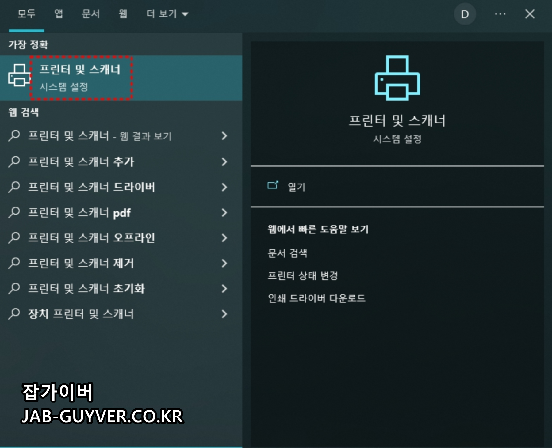 좌측하단 윈도우 검색 창에 프린터 및 스캐너 입력 후 들어갑니다.