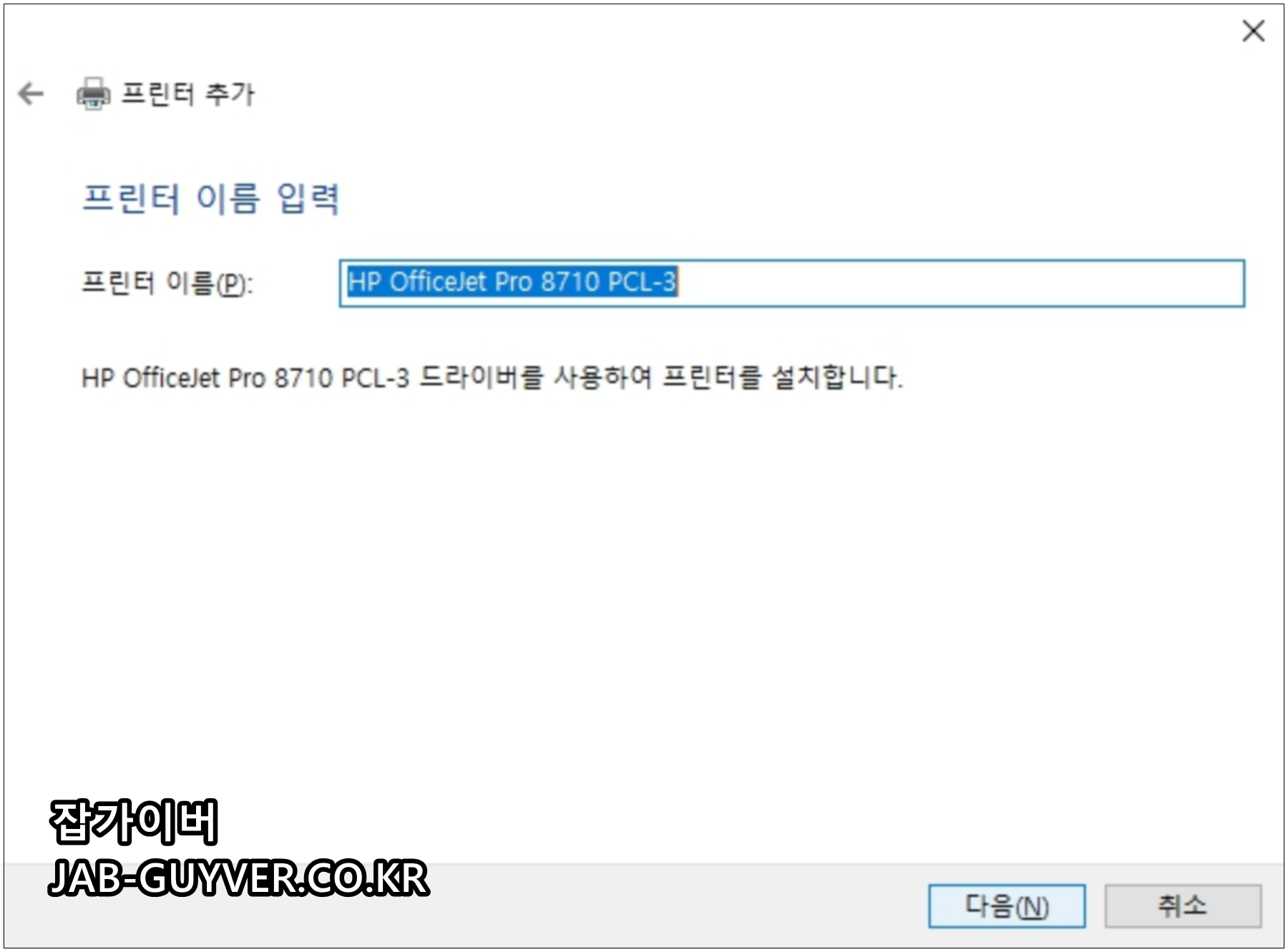 프린터 IP주소를 통해 HP Officejet Pro 8710 PCL-3 자동으로 등록되었으며 원하는 프린터 이름을 변경할 수 있습니다.